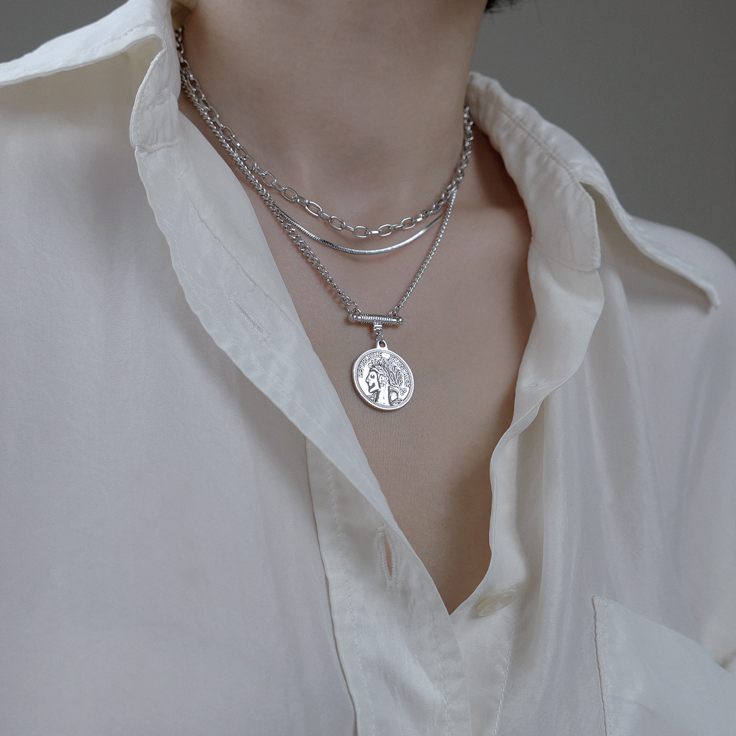 圆牌多层叠带项链女古罗马钱币吊坠网红锁骨链欧美风嘻哈颈链配饰