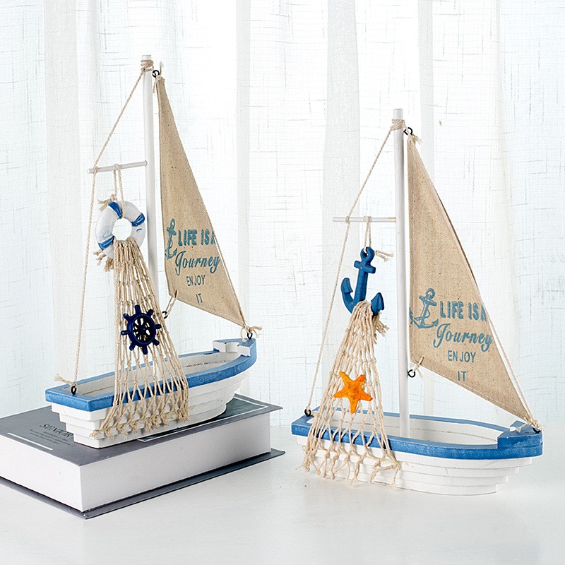 地中海实木制模型摆件蓝白帆布船家居装饰摆设一帆风顺工艺品定制