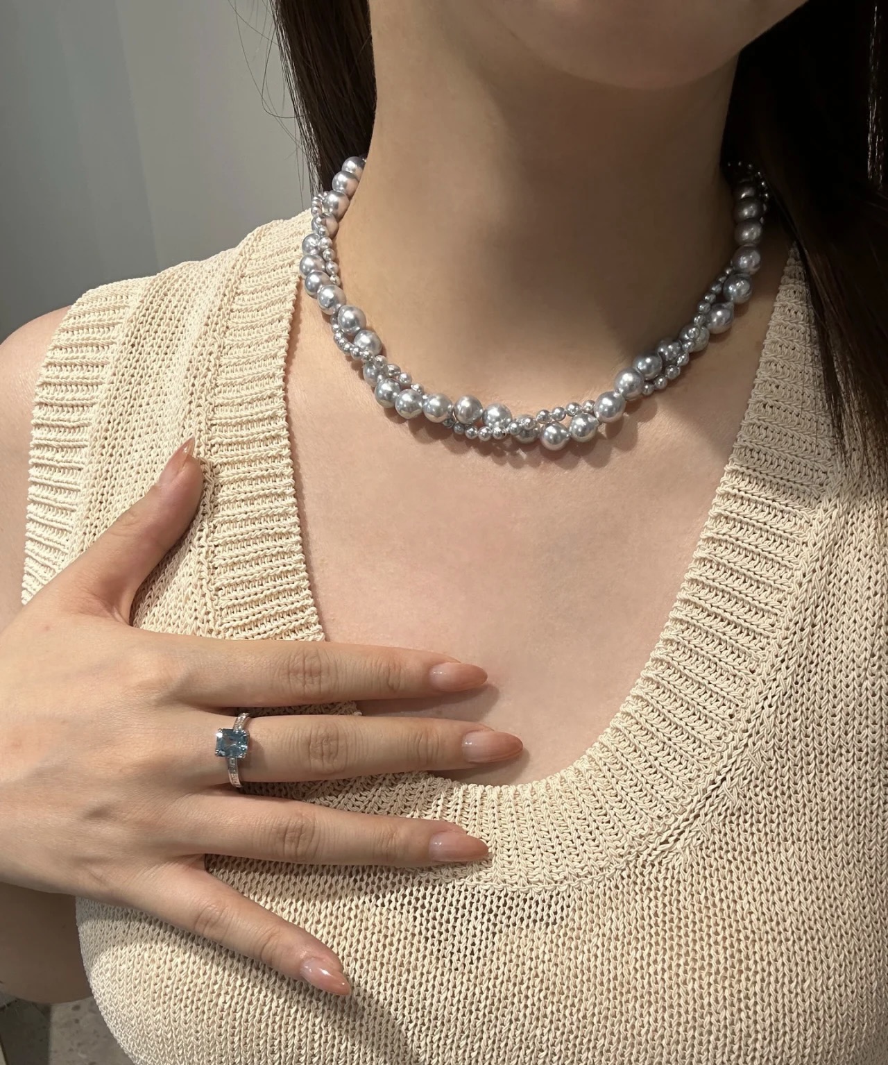 NorthDay缠绕叠戴施家高级感8+4真多麻灰色双层珍珠蝴蝶结葵花扣