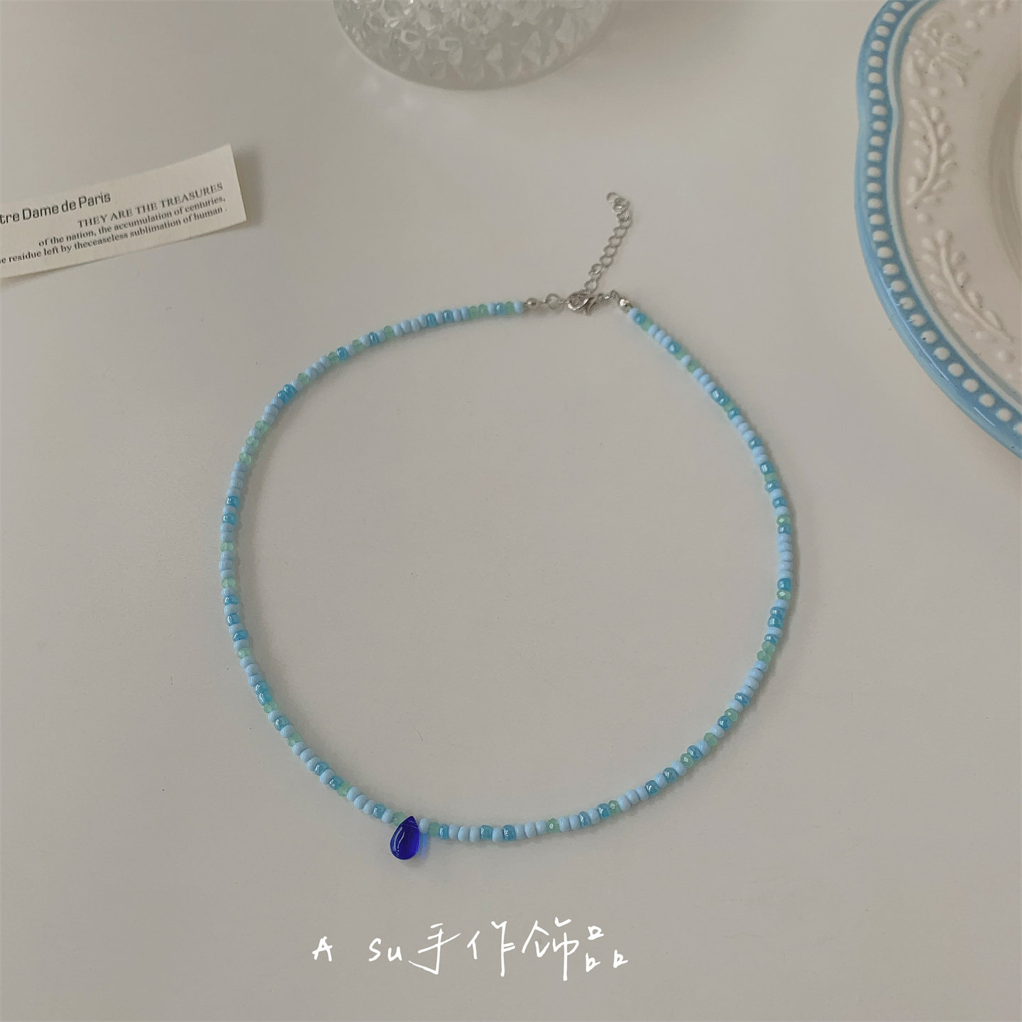 满25包邮】显白蓝!蓝色串珠项链女锁骨链米珠圆珠颈链2026年春夏
