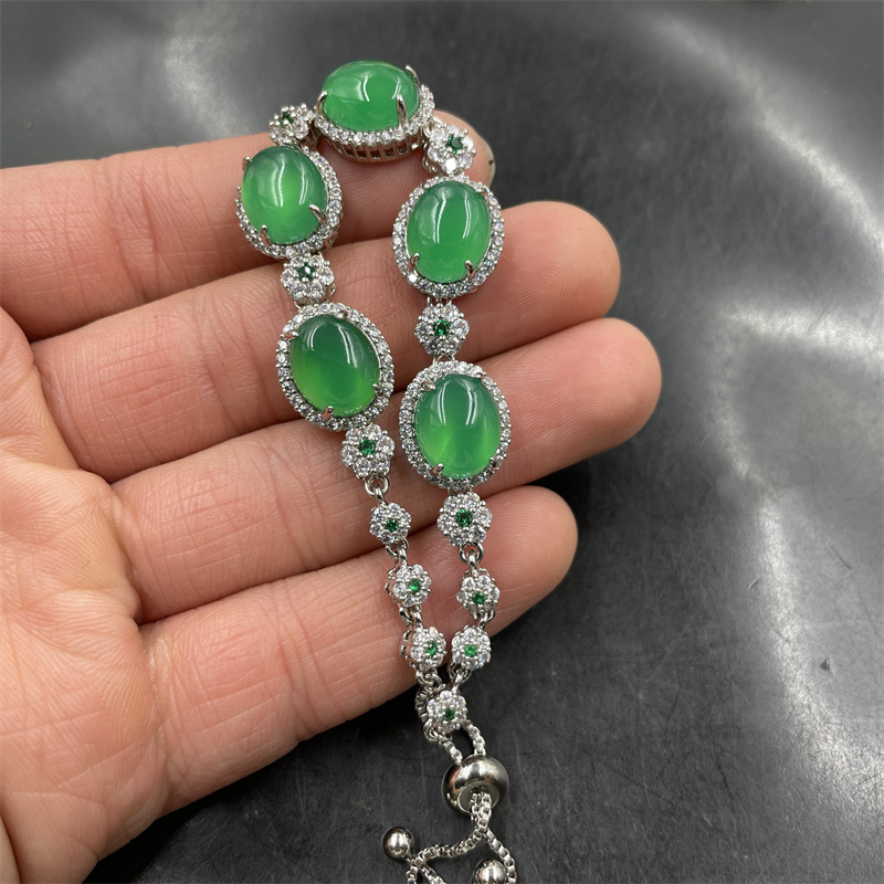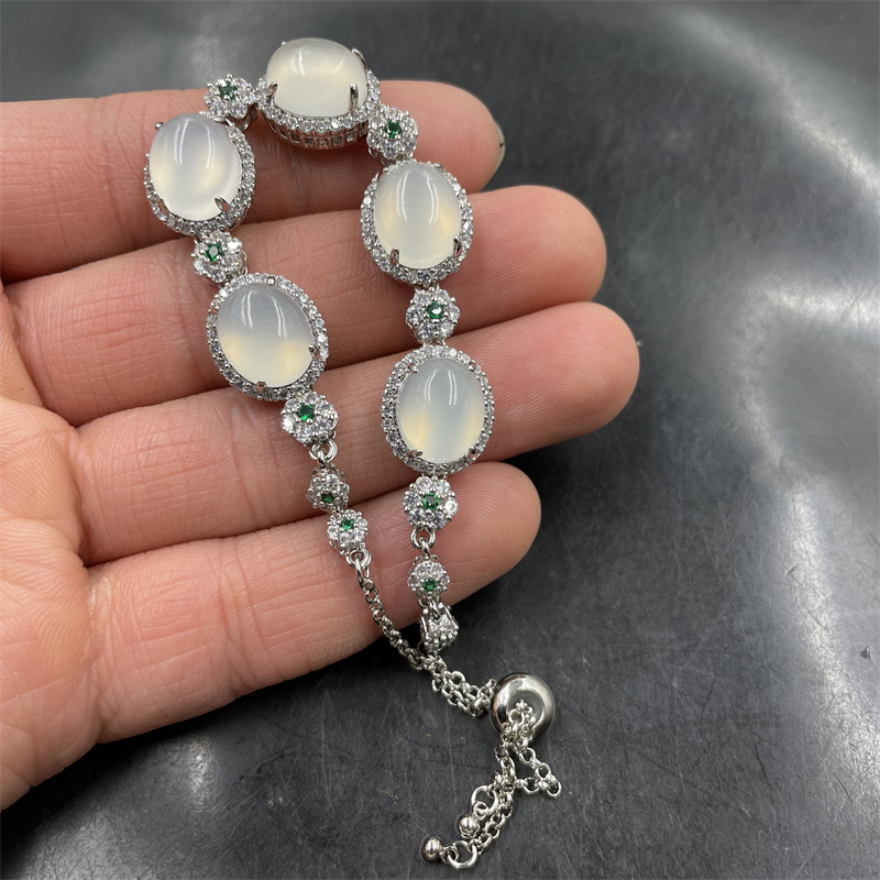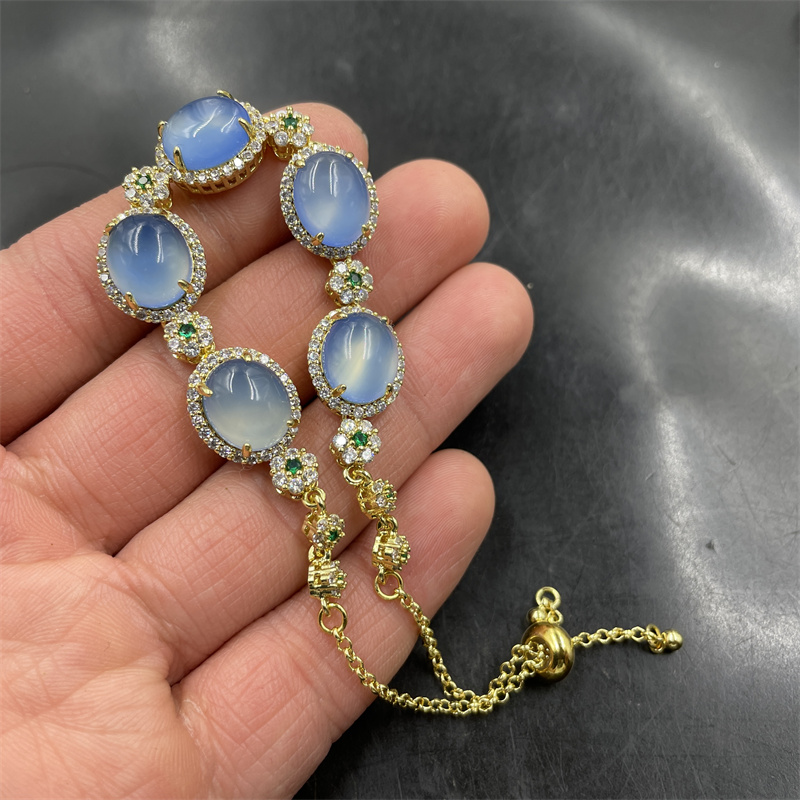 高冰白玉髓手链 亮金镶嵌绿玛瑙手链 可伸缩粉色女式玉髓手串蓝色