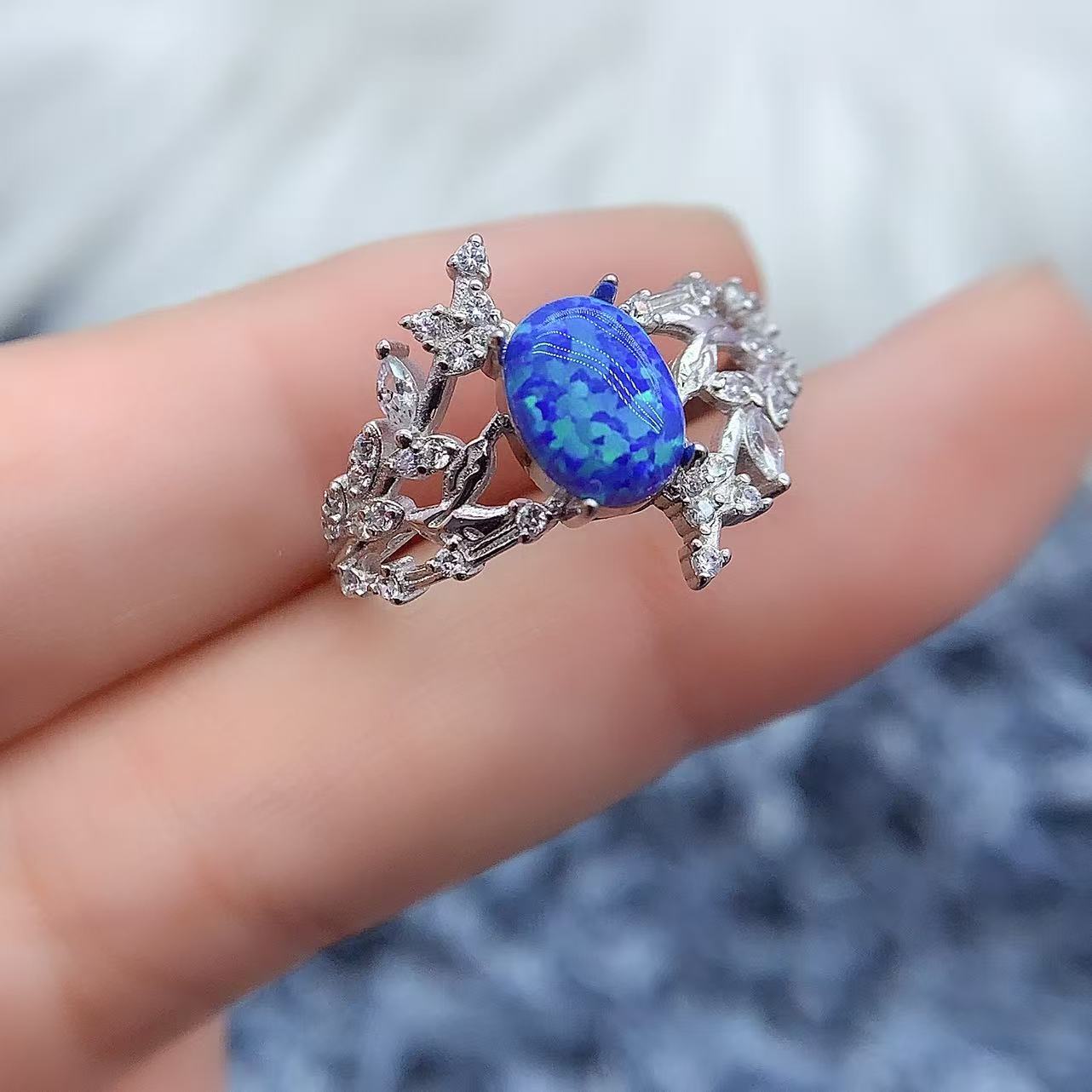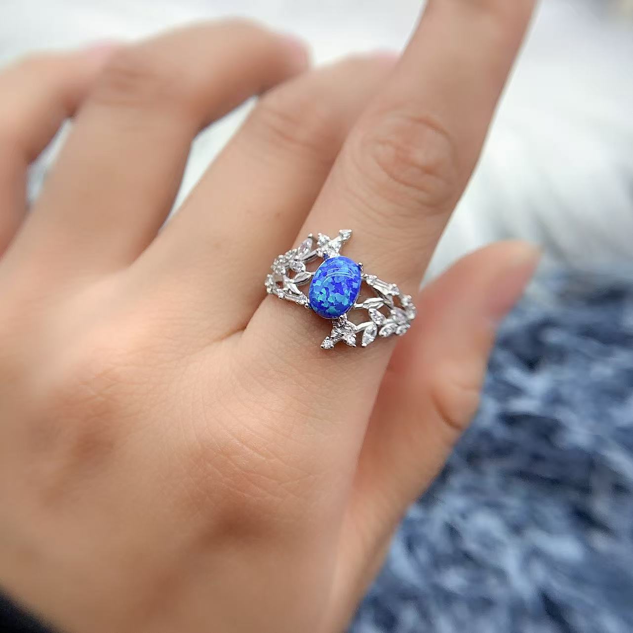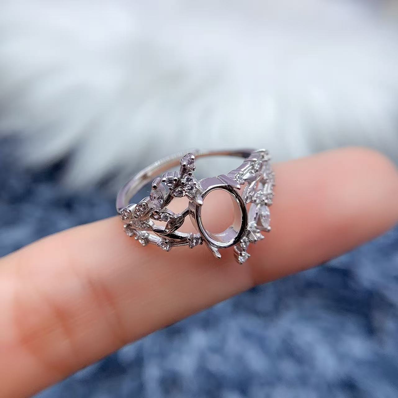 s925纯银戒指空托椭圆形6*8mm轻奢树叶活口夸张风高贵气质百搭饰