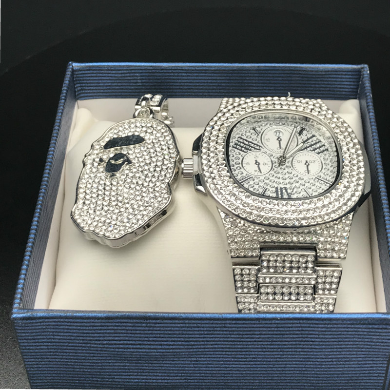 Hiphop嘻哈项链男欧美说唱潮人镶钻手表满钻女猿人头朋克个性吊坠