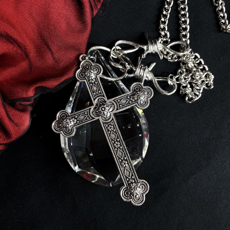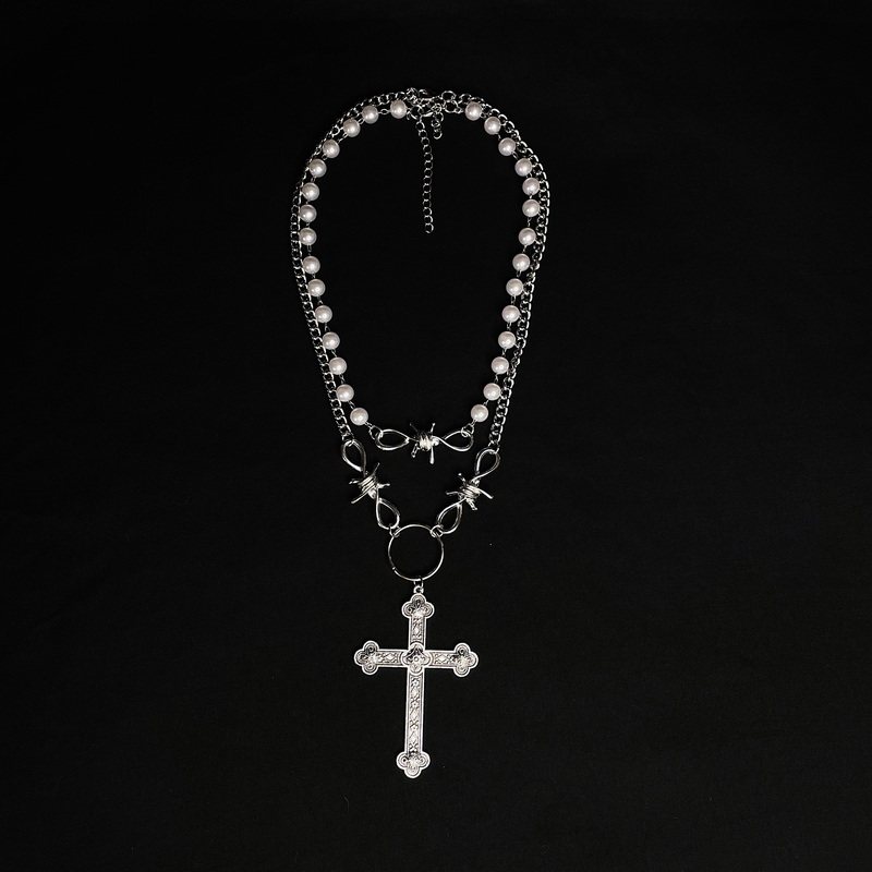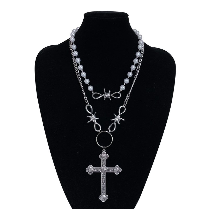 黑羽天使祭 暗黑哥特复古十字架珍珠项链2件套情侣锁骨链 套装