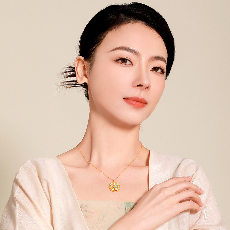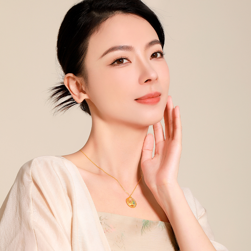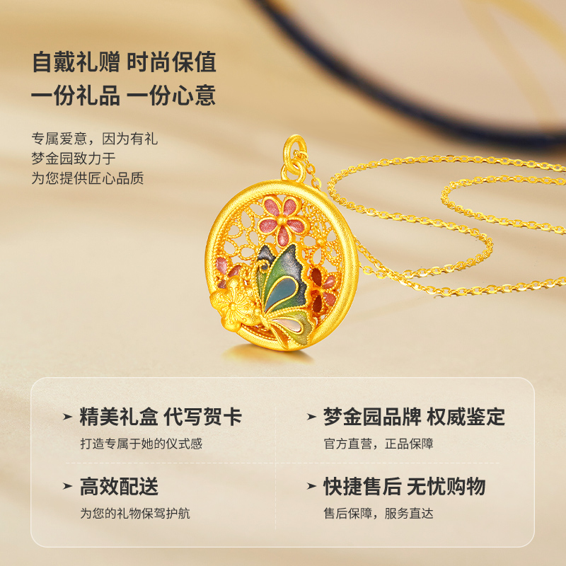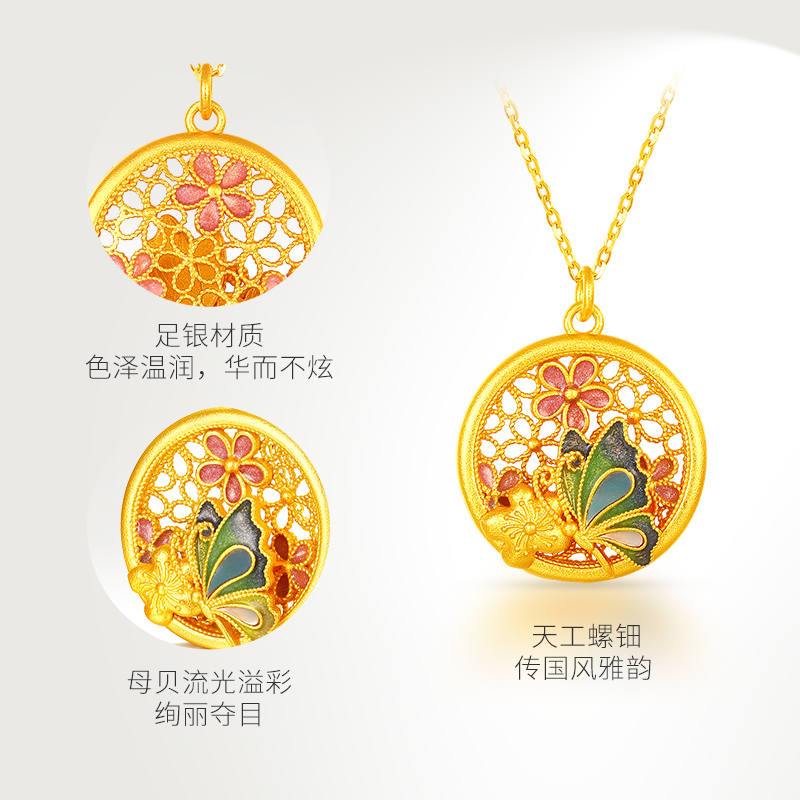 梦金园天工螺钿蝴蝶花牌银项链女款新中式小众吊坠送女友生日礼物