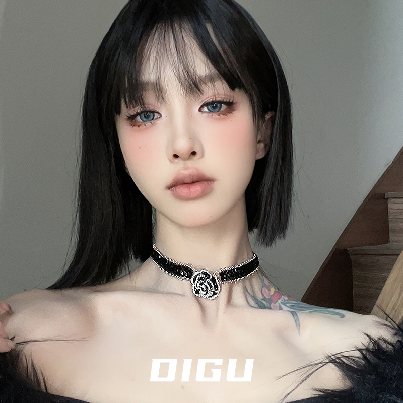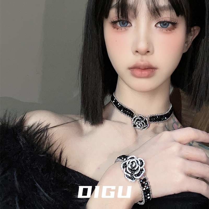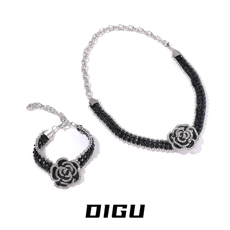 DIGU气质法式复古山茶花项链手链套装轻奢高级感黑色串珠花朵颈链