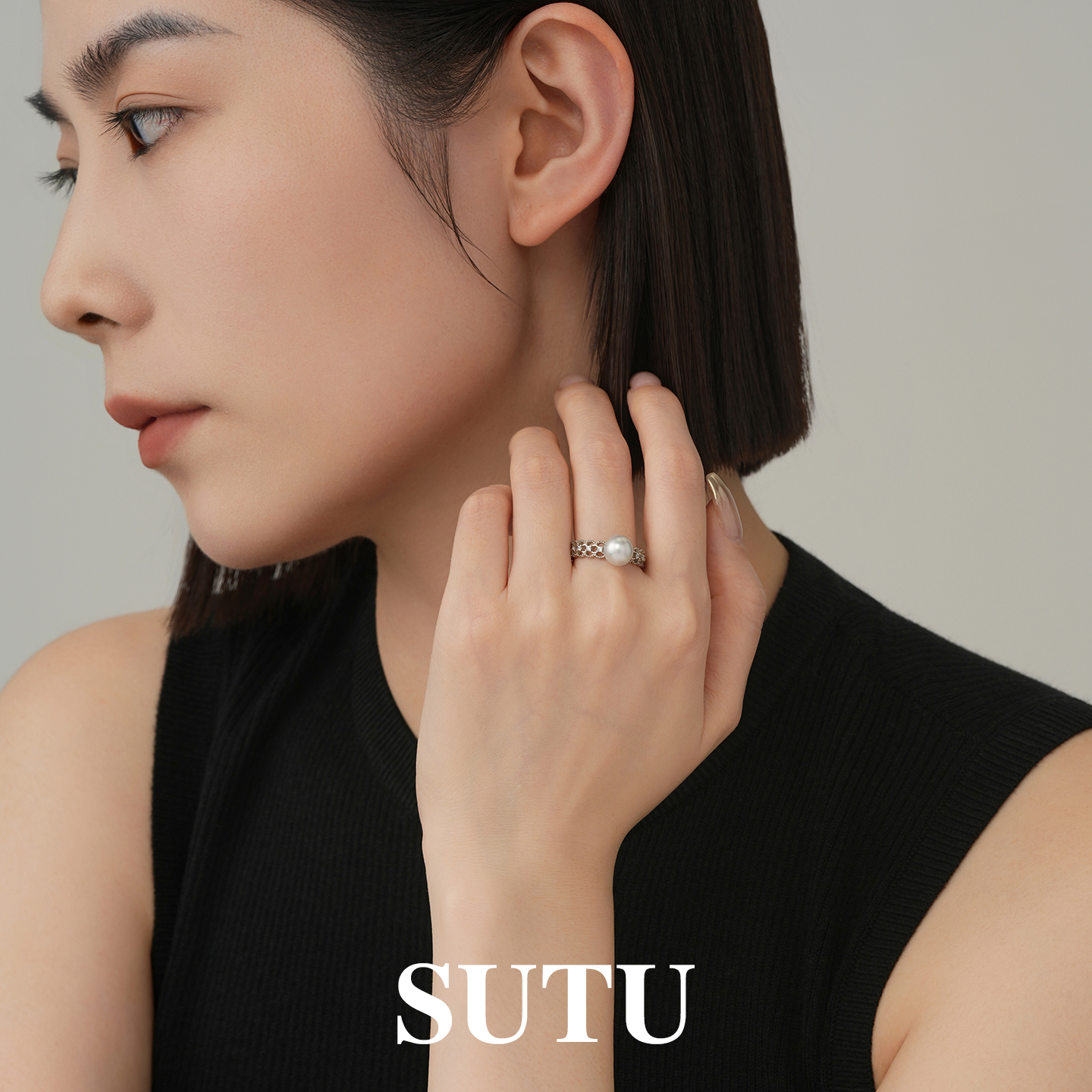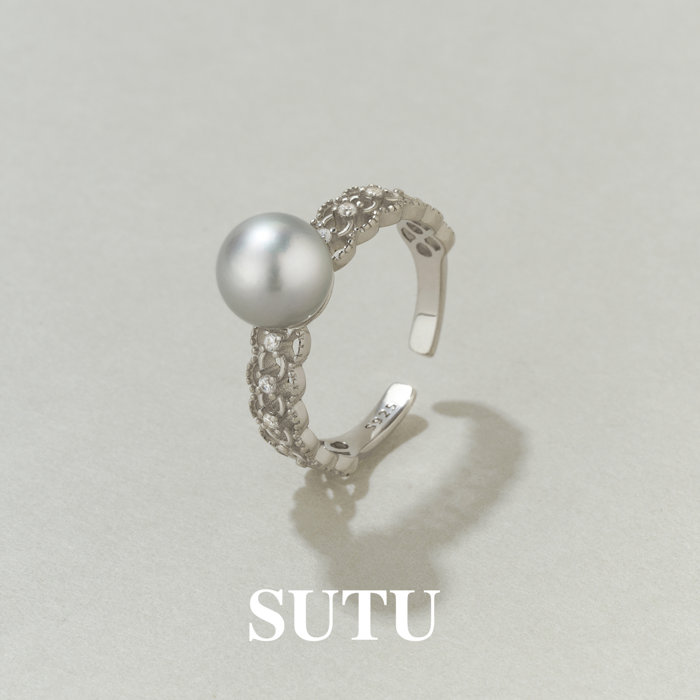 素图蕾丝海水灰珍珠戒指925银轻奢气质真多麻时尚高级感指环女款