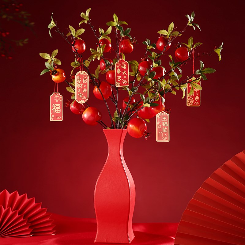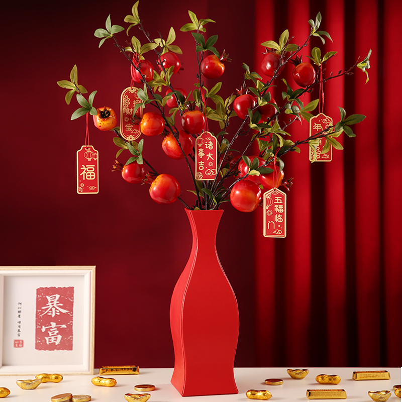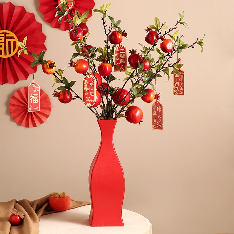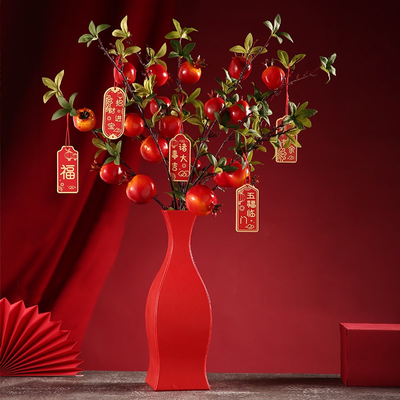 氛围感摆件红色福桶石榴插花瓶创意2023兔年春节家用客厅喜庆装饰