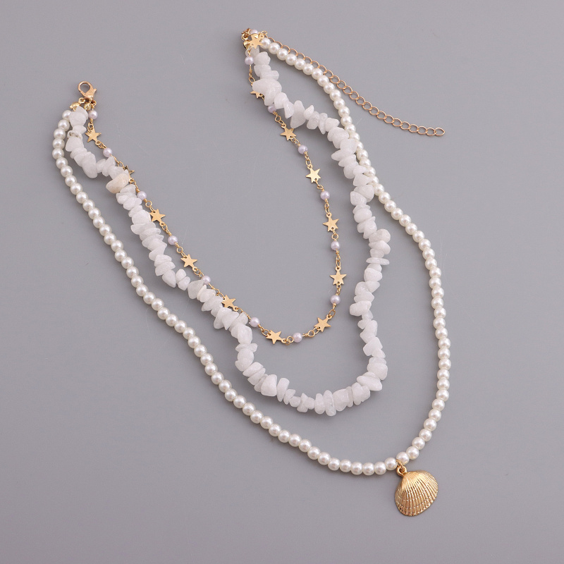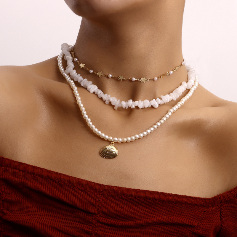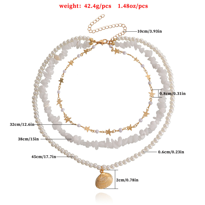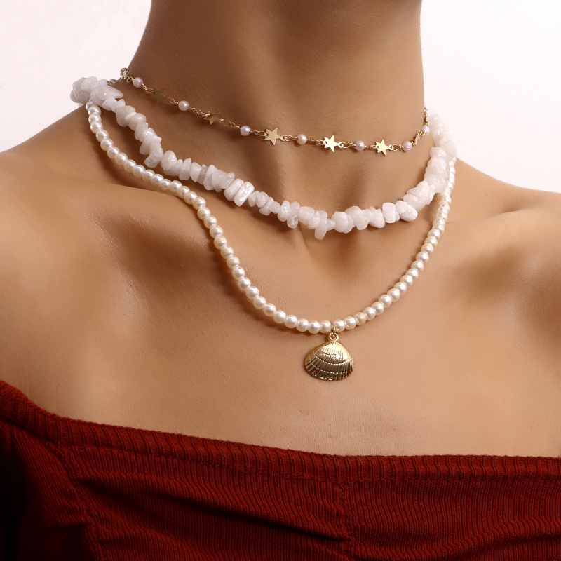 欧美饰品 三层珍珠白色松石五角星扇贝吊坠项链女 轻奢风项饰首饰
