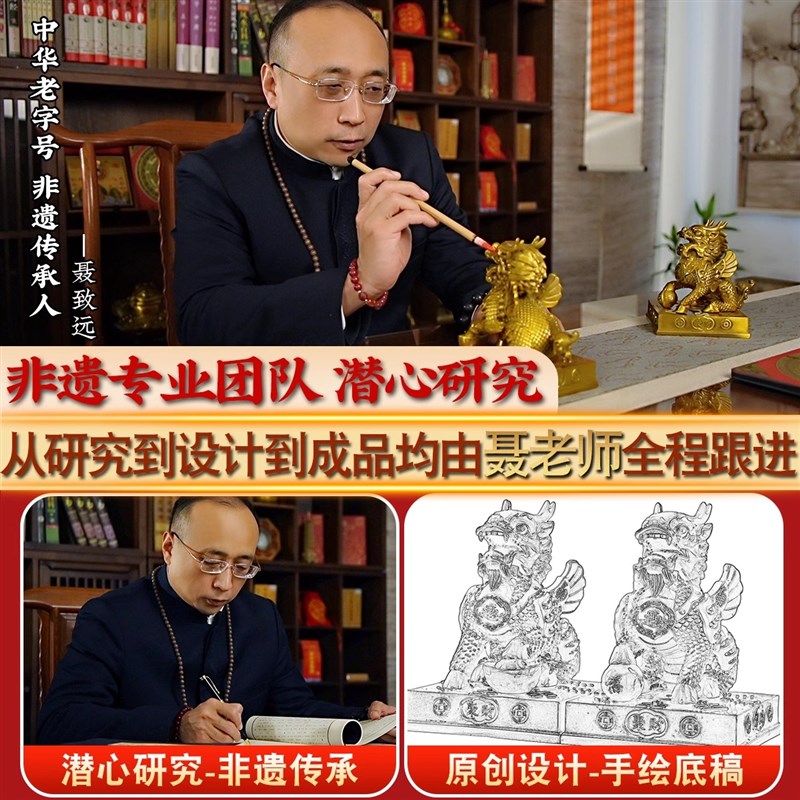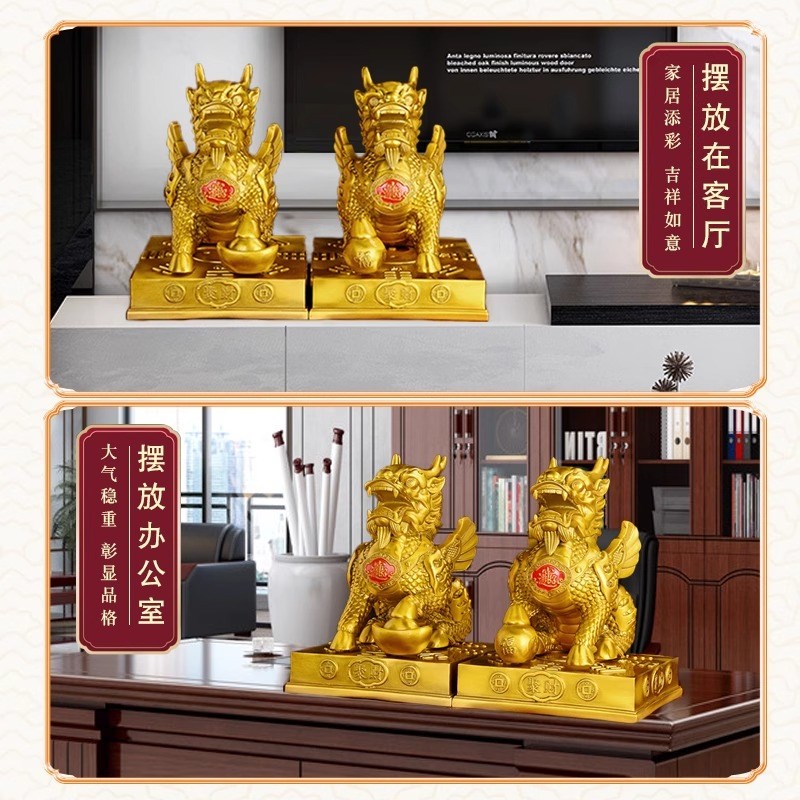 纯全黄铜麒麟摆件公母一对聚w财办公室阳台家居客厅工艺品店铺摆