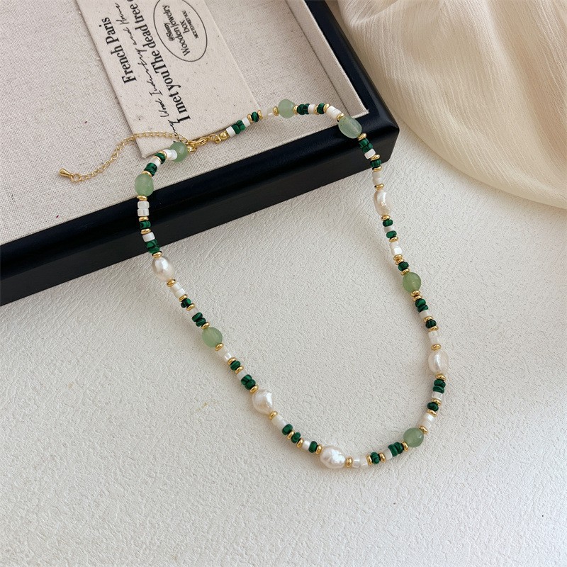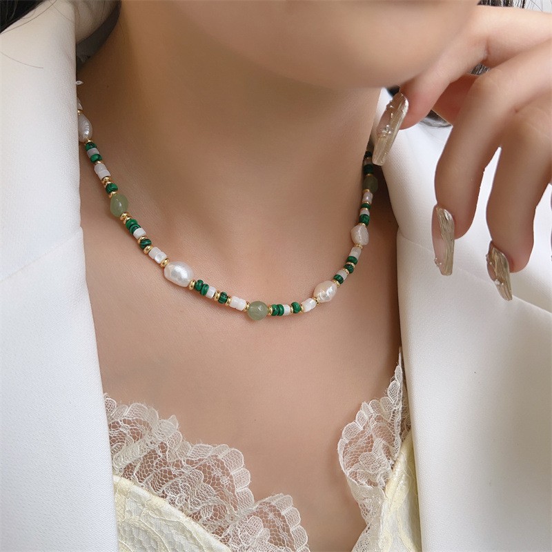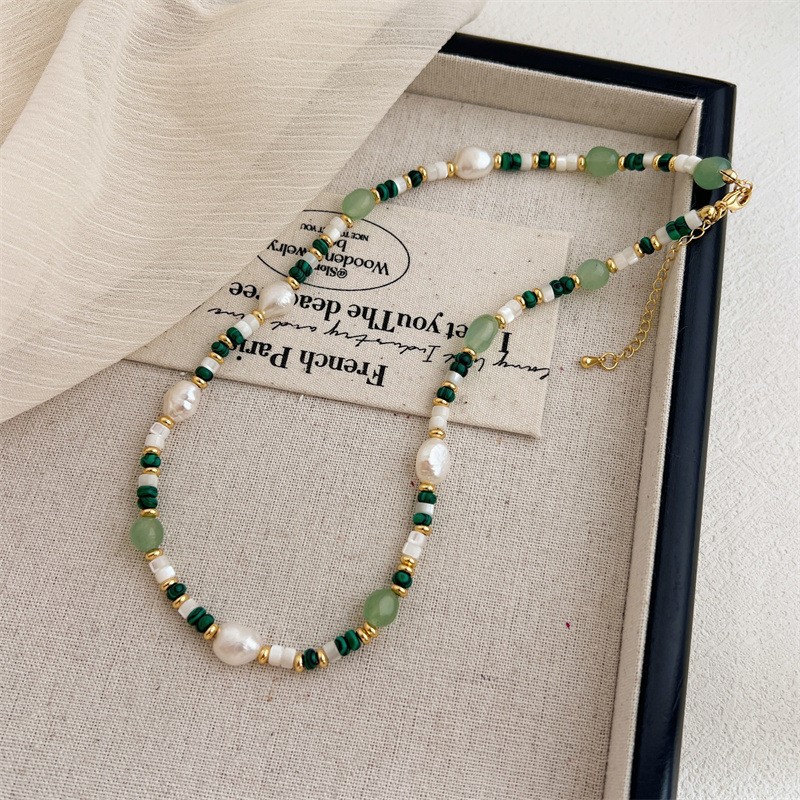 孔雀石头天然珍珠项链绿色串珠锁骨链