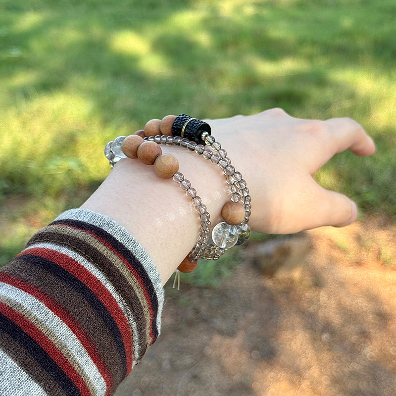 天然水晶茶水晶三圈手链原创设计款沉香木时尚多圈绿幽灵手串