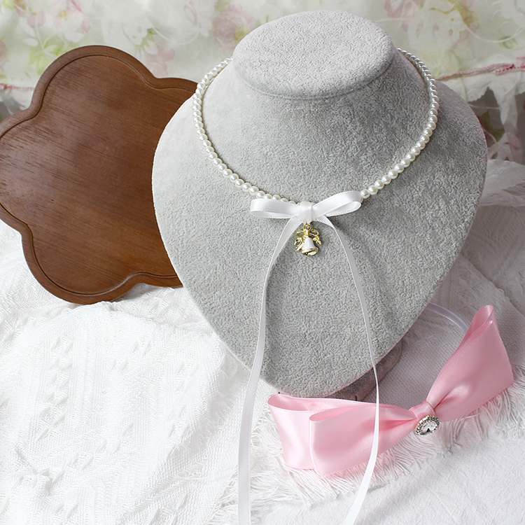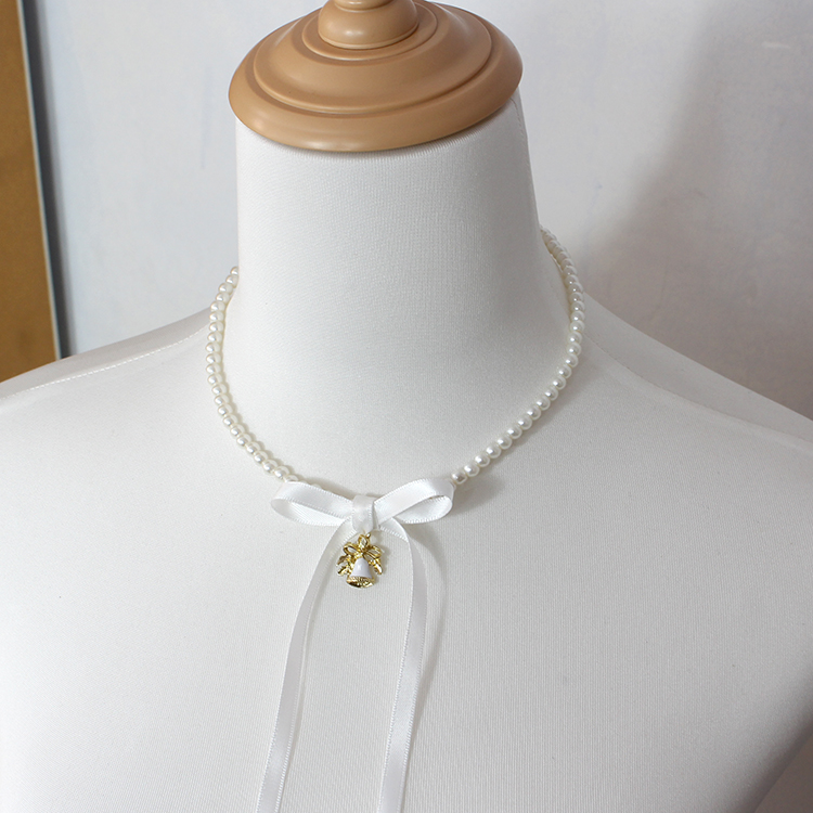 白色长款丝带蝴蝶结仿珍珠项链锁骨链圣诞Lolita少女甜妹可爱铃铛