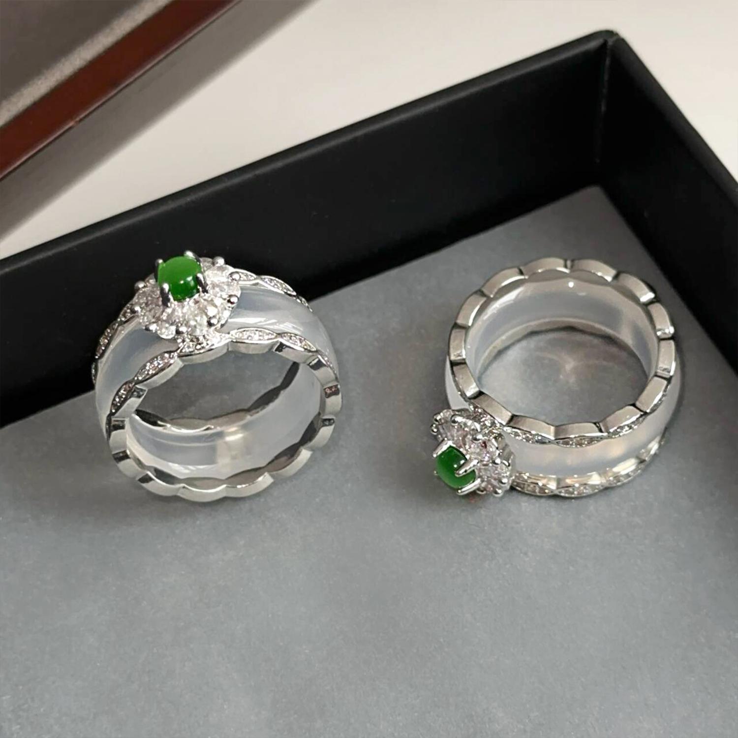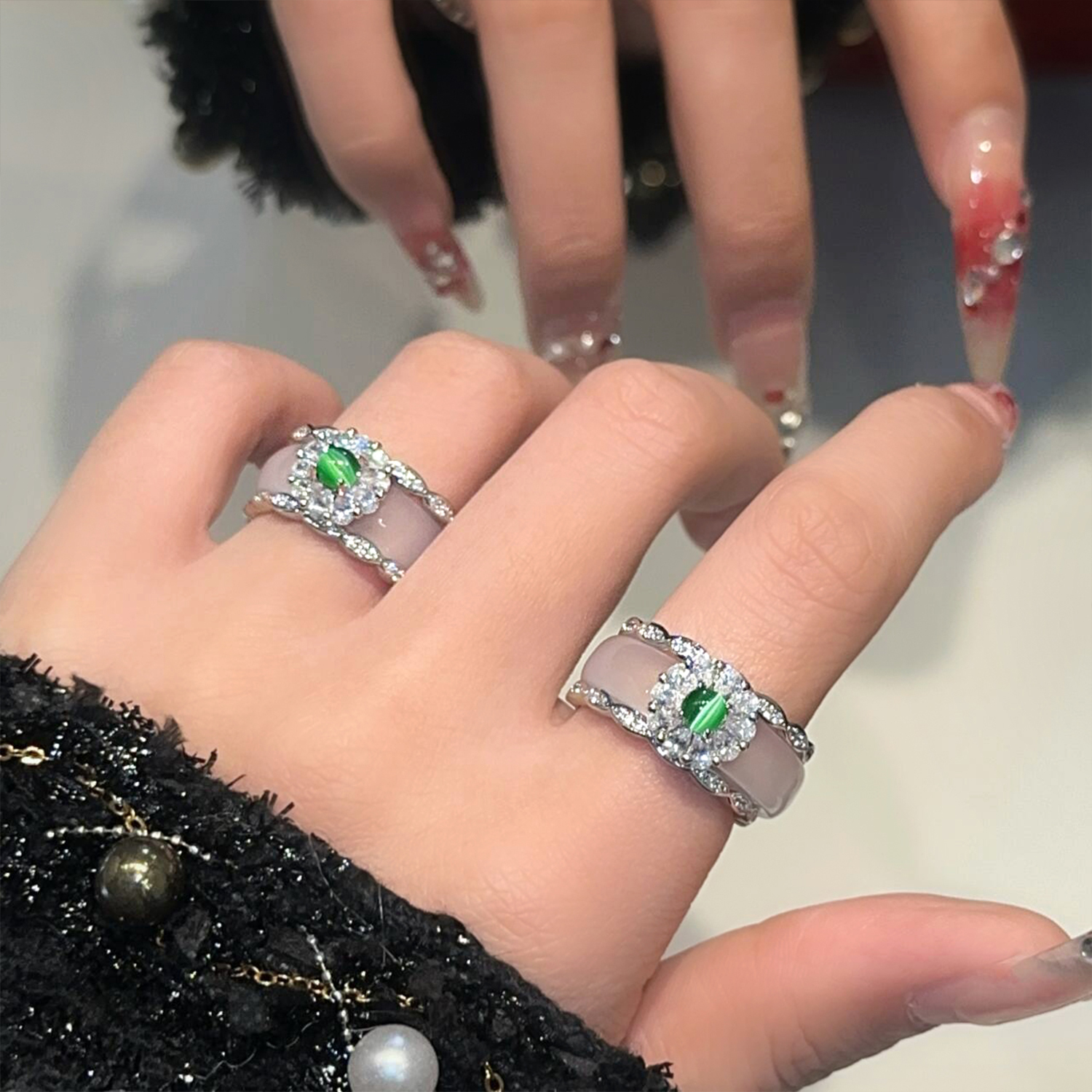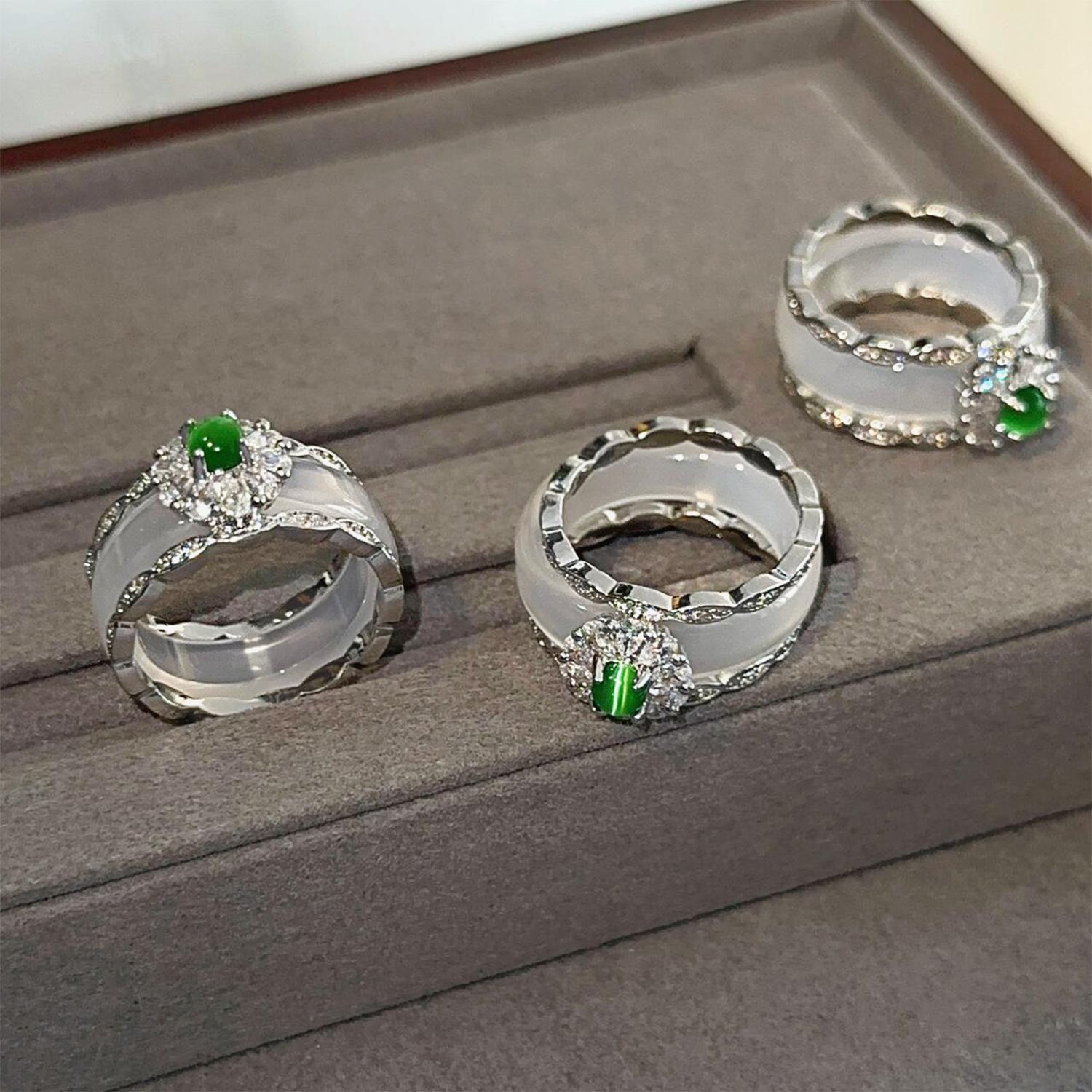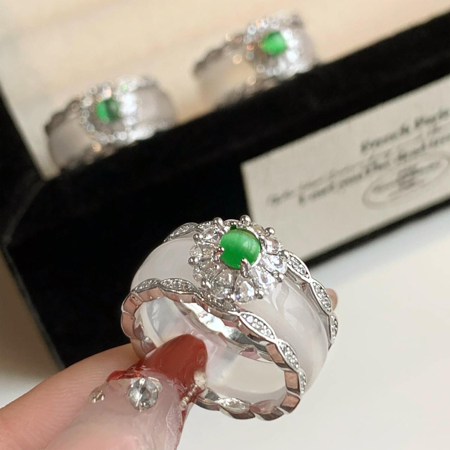 新中式富贵白月光白玉髓戒指女玉石戒指宽版绿锆石冷淡风中古指环