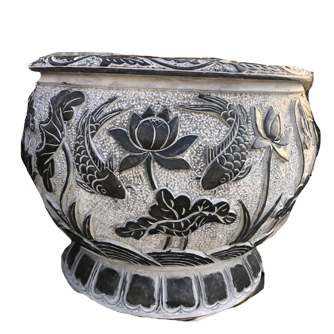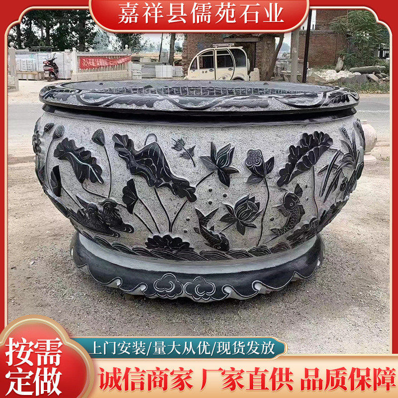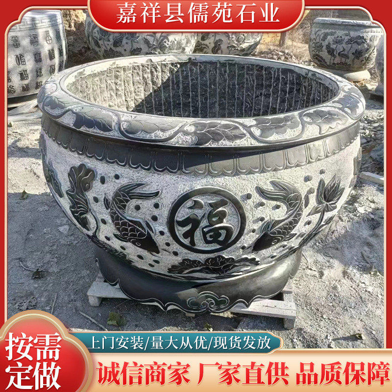 天然仿古石雕鱼缸别墅庭院户外青石雕刻流水石缸摆件古法雕花鱼缸
