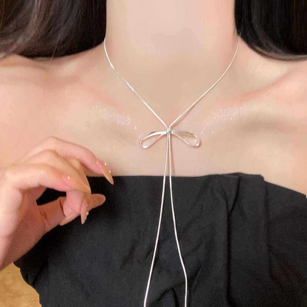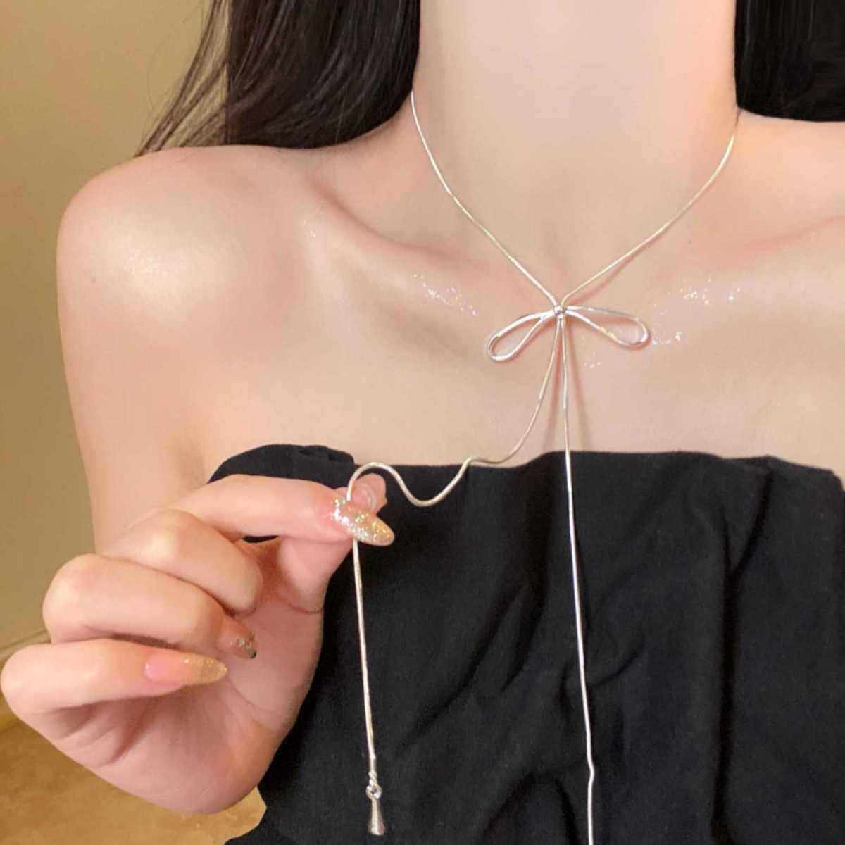 蝴蝶结吊坠抽拉项链女秋冬韩系长款装饰毛衣链银色高级感配饰穿搭