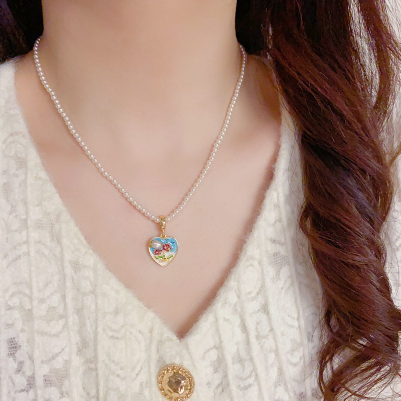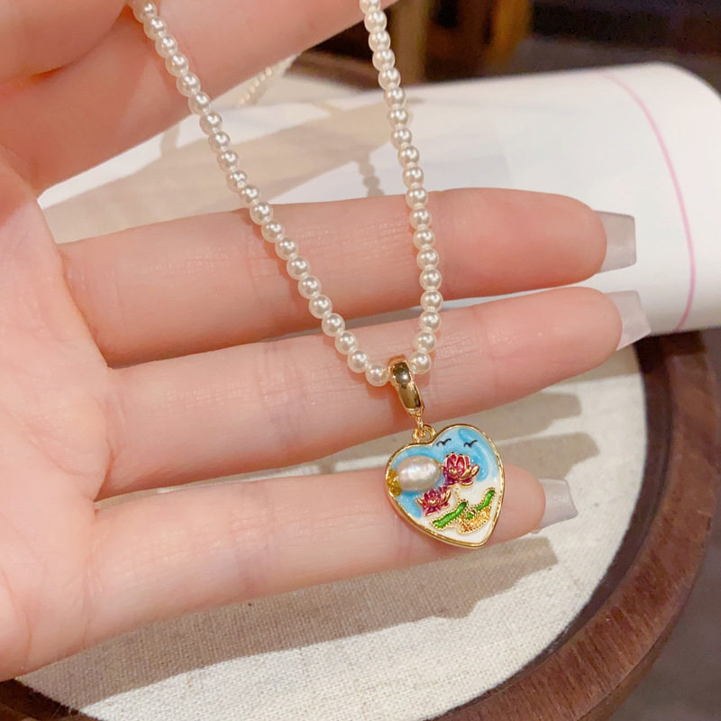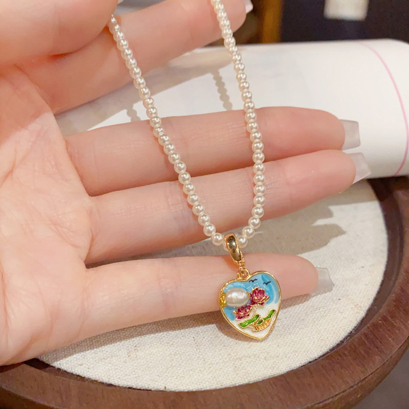 天然淡水珍珠项链女轻奢小众设计爱心吊坠锁骨链小众款彩色珐琅饰
