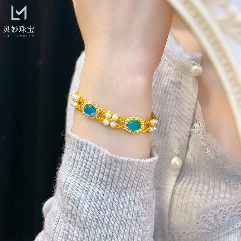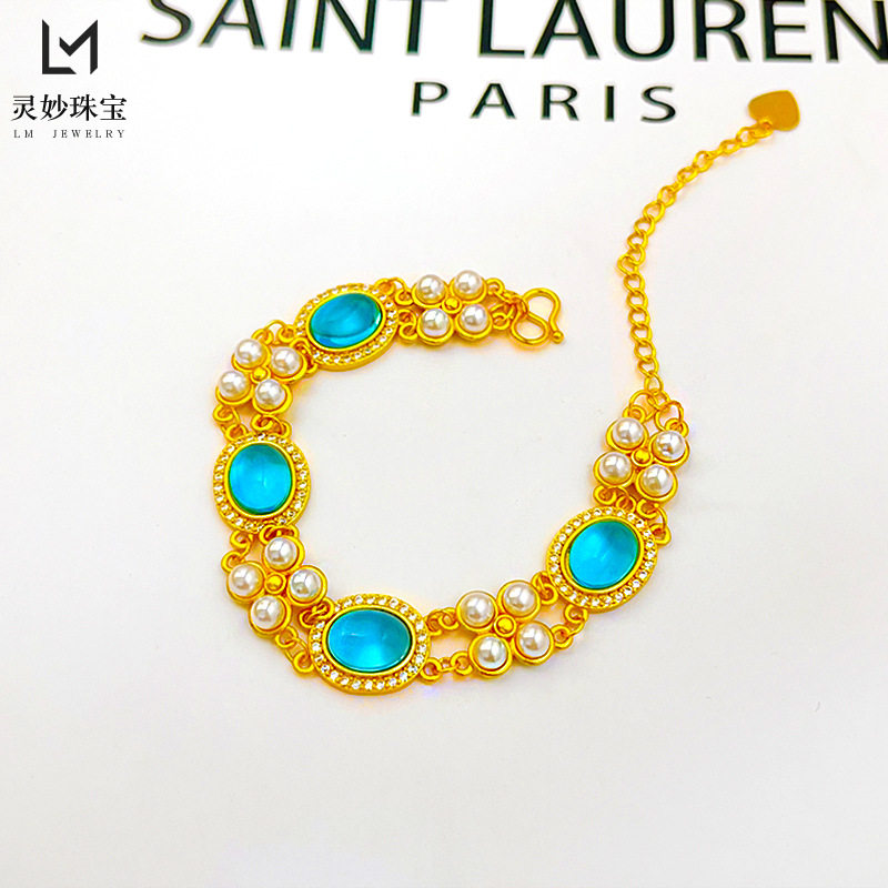 金店同款沙金海蓝色双层珍珠中古风宫廷手链轻奢气质手串女送礼物