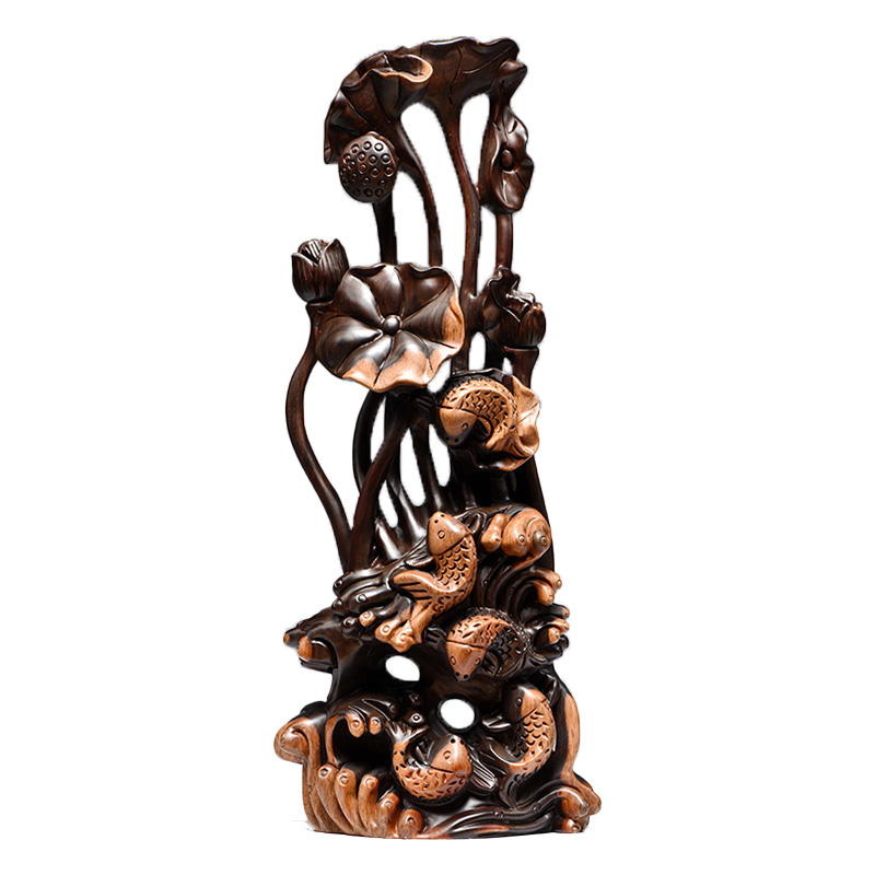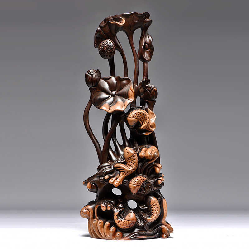 黑檀木雕刻年年有鱼根雕荷花摆件家居客厅K玄关装饰工艺品乔迁送