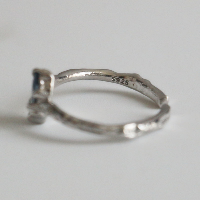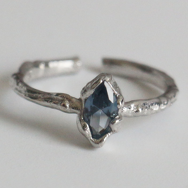 S925纯银冷淡风戒指小众设计不规则肌理轻奢锆石开口戒蓝色水滴女