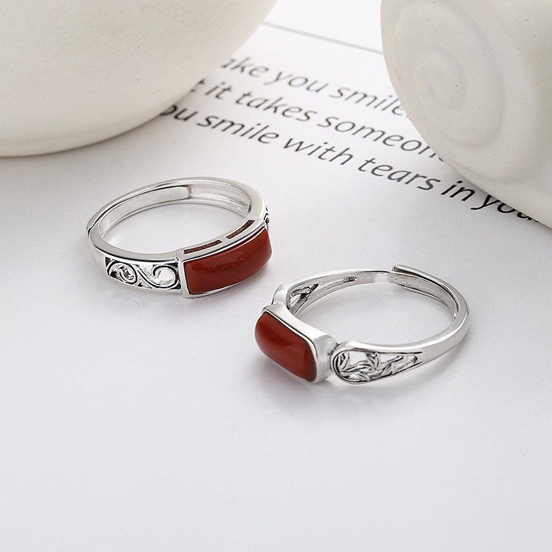 创意树叶镂空造型戒托红色长方形锆石民族风开口戒指饰品