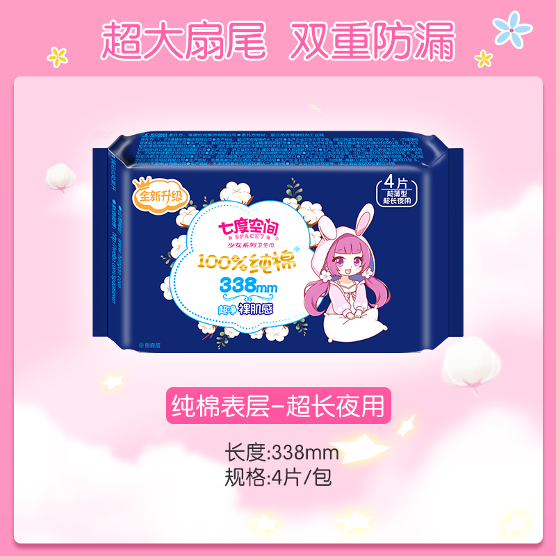 七度空间卫生巾女超长夜用纯棉6包338mm组合装少女专用整箱姨妈巾