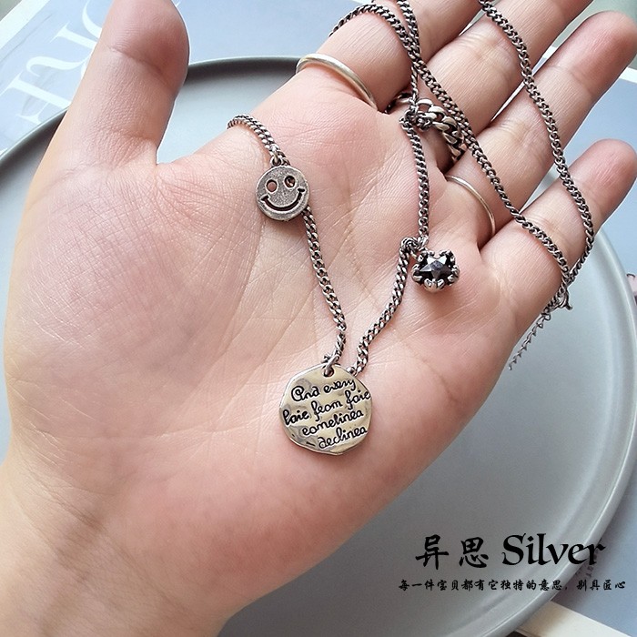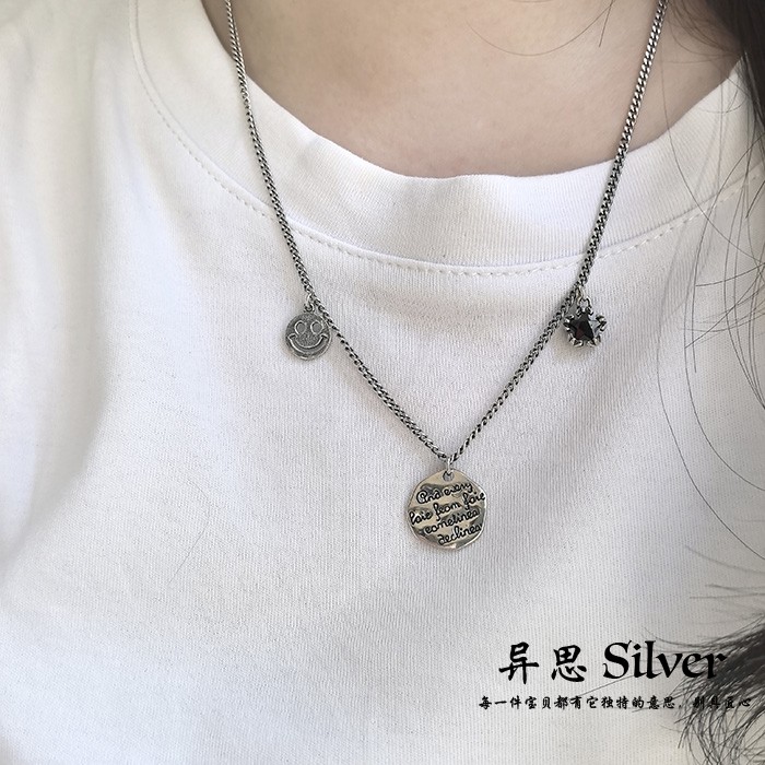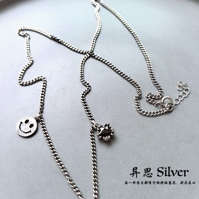 原创设计 S925纯银字母牌五角星项链 复古链条笑脸 小众个性时尚
