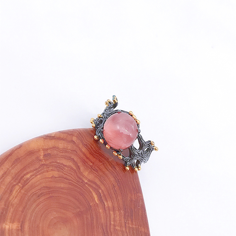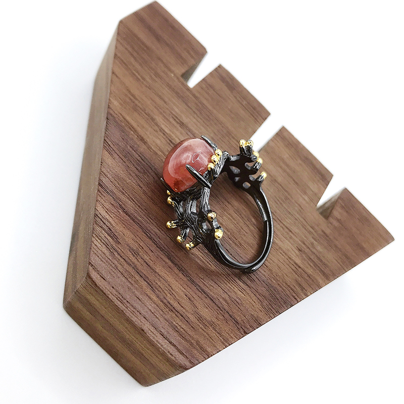 原创孤品红纹石戒指可调节开口蛋面纯银镀黑金镶嵌复古简约银饰