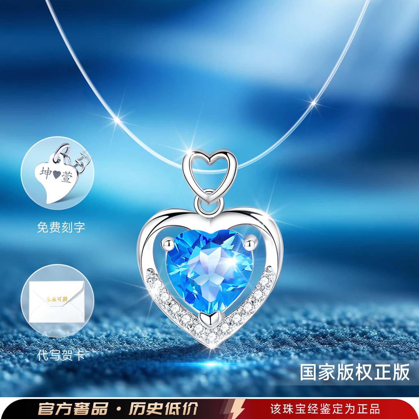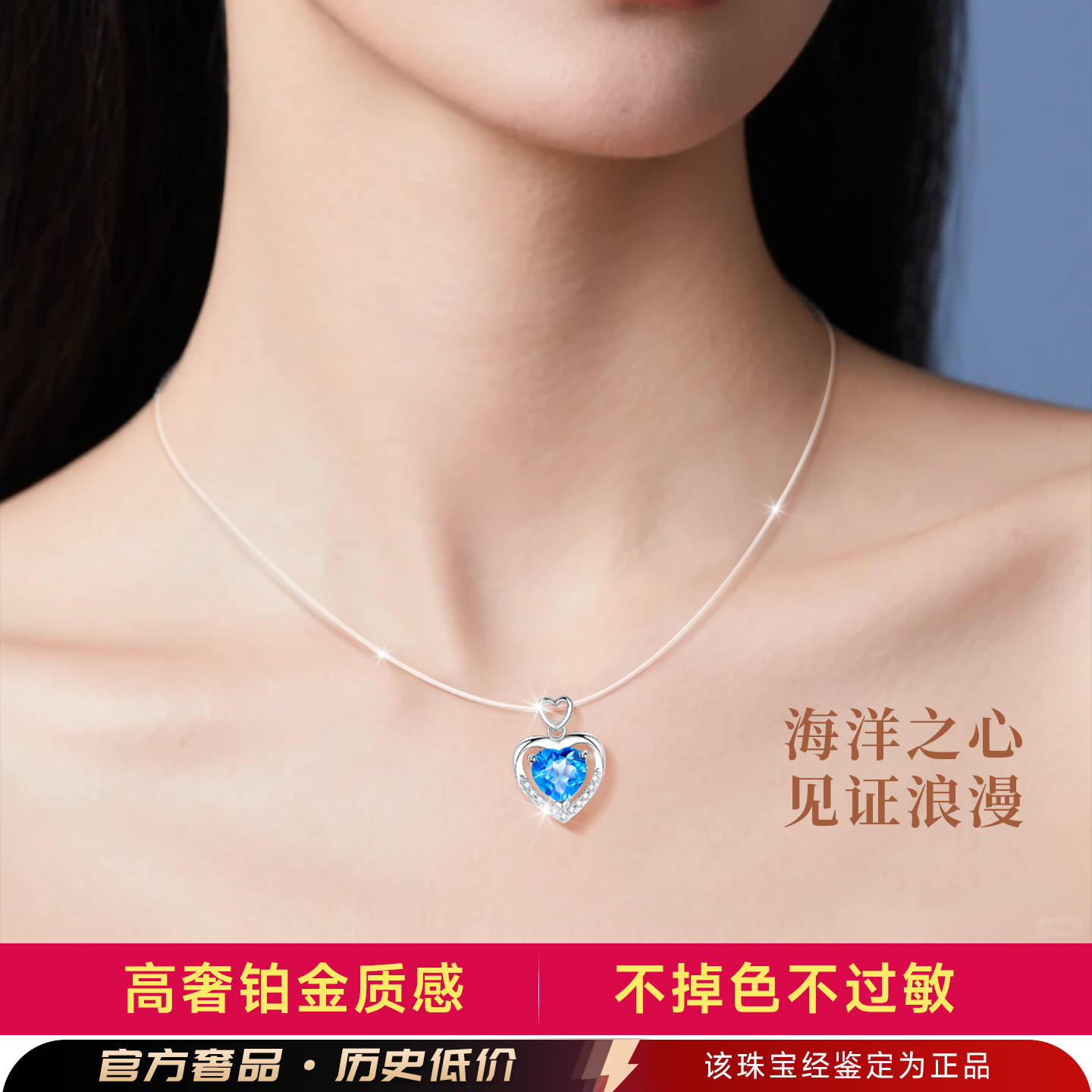 银项链女款女纯银隐形鱼线天然托帕石蓝色宝石海洋之心吊坠女士女