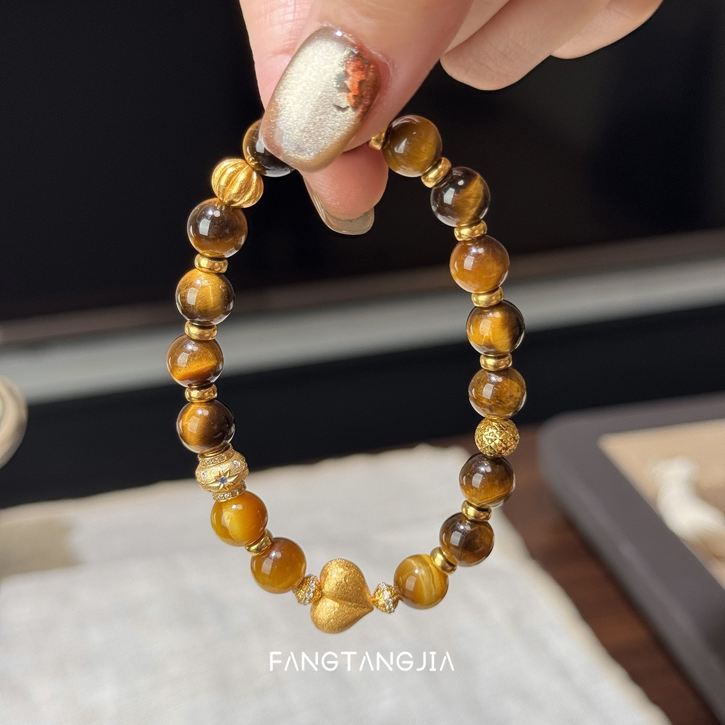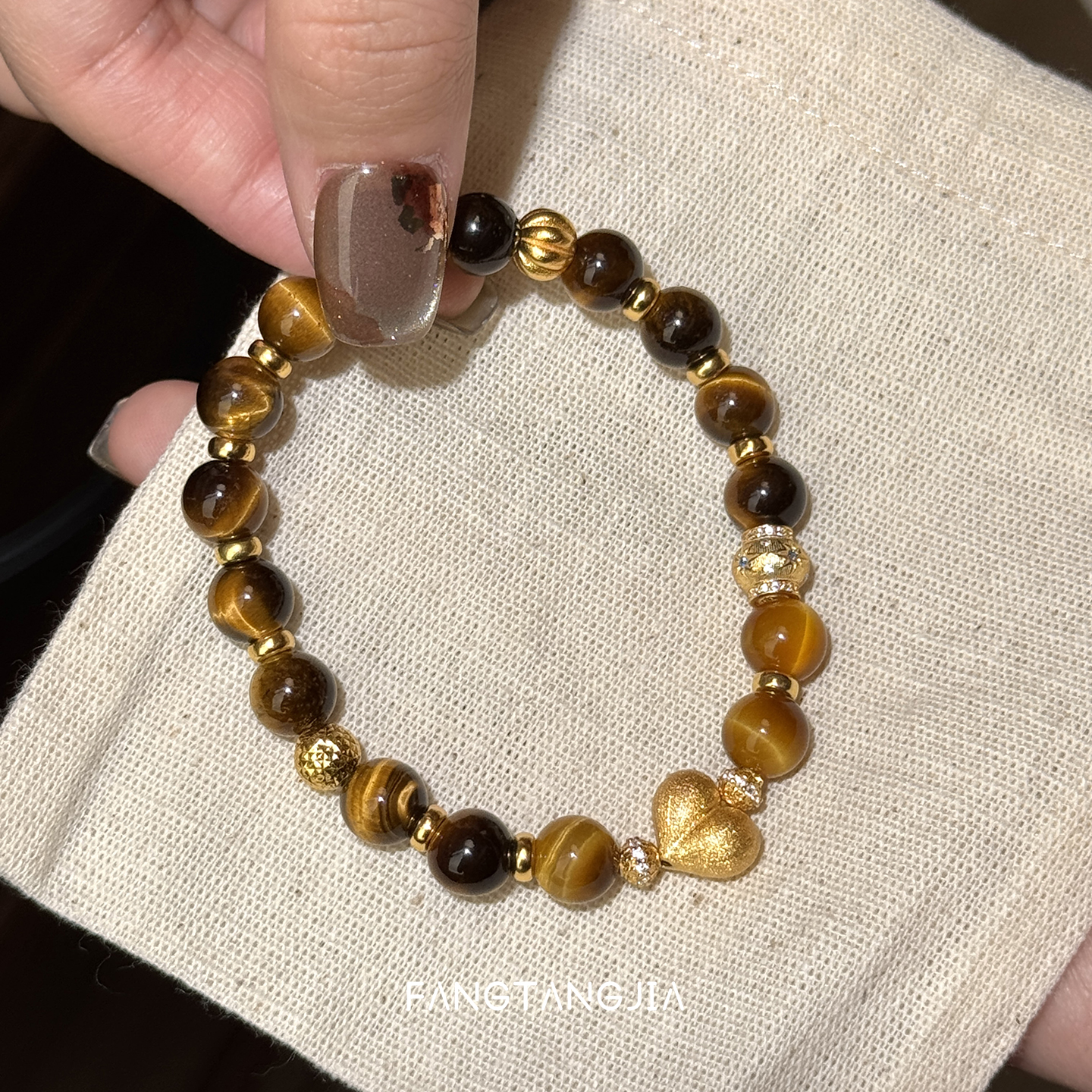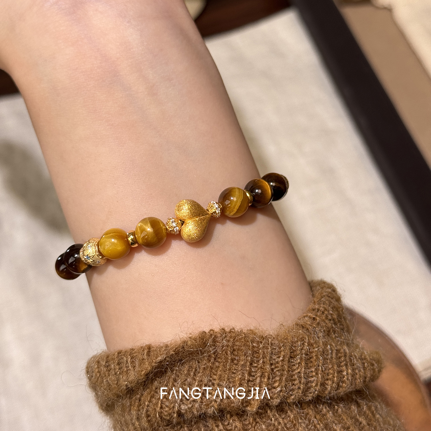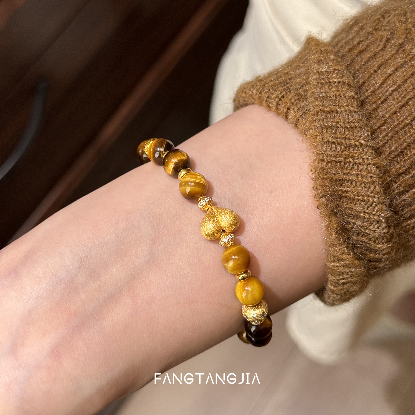 方糖家 原创美拉德秋冬虎眼石拉丝桃心串珠纯银手链轻奢手链女款