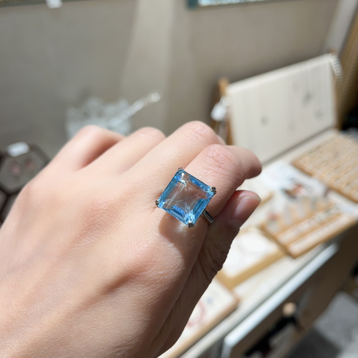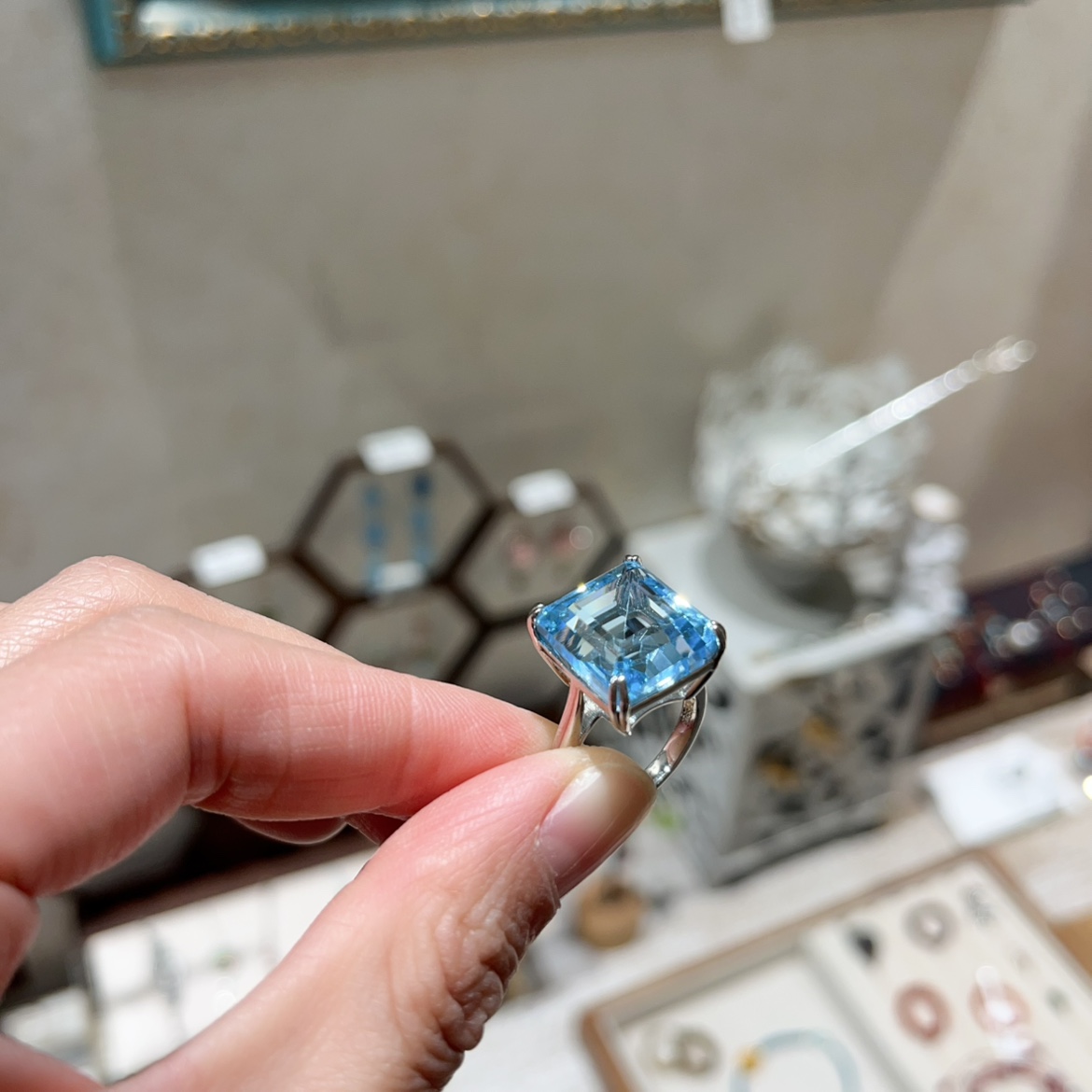天然正方形蓝托帕石戒指女款S925银镶嵌13圈口原创设计