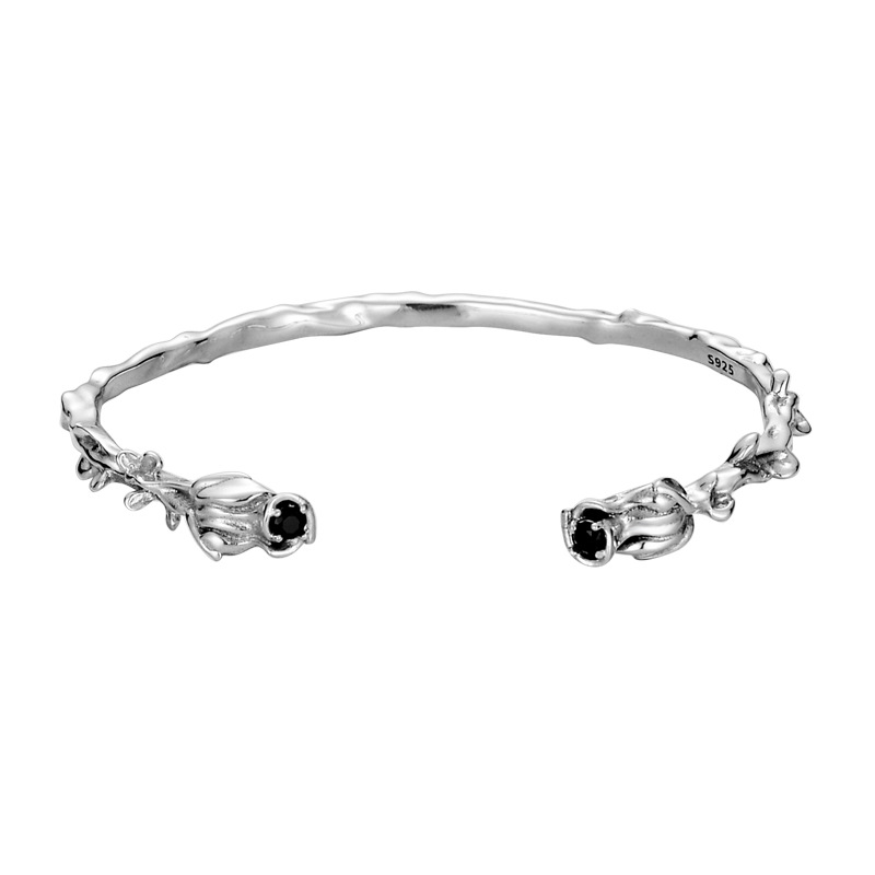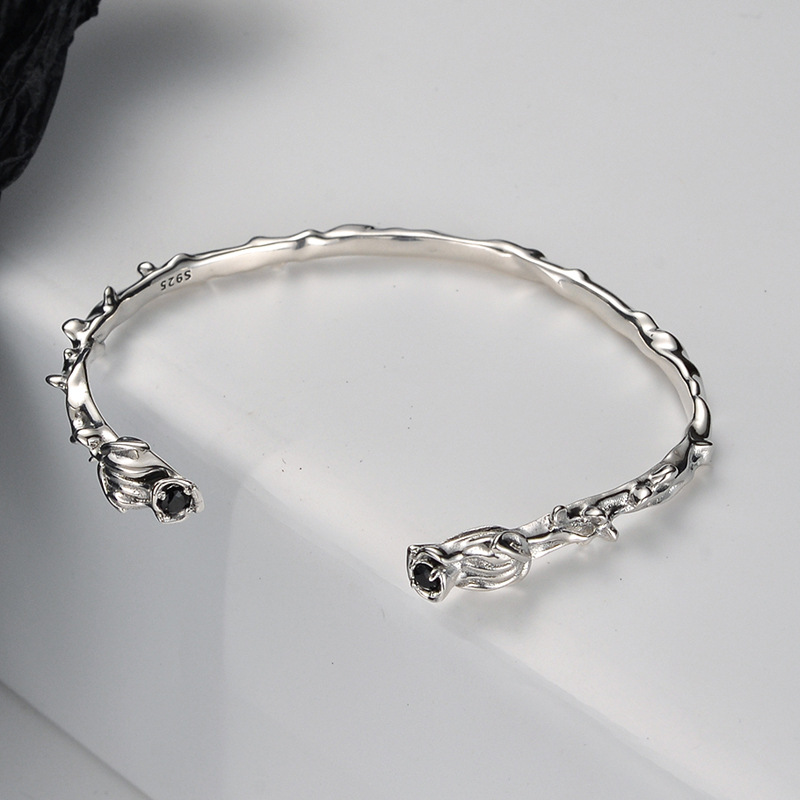 日本品质S2090 韩版气质S925纯银玫瑰花手镯女开口时尚复古银花蕾