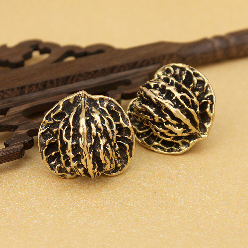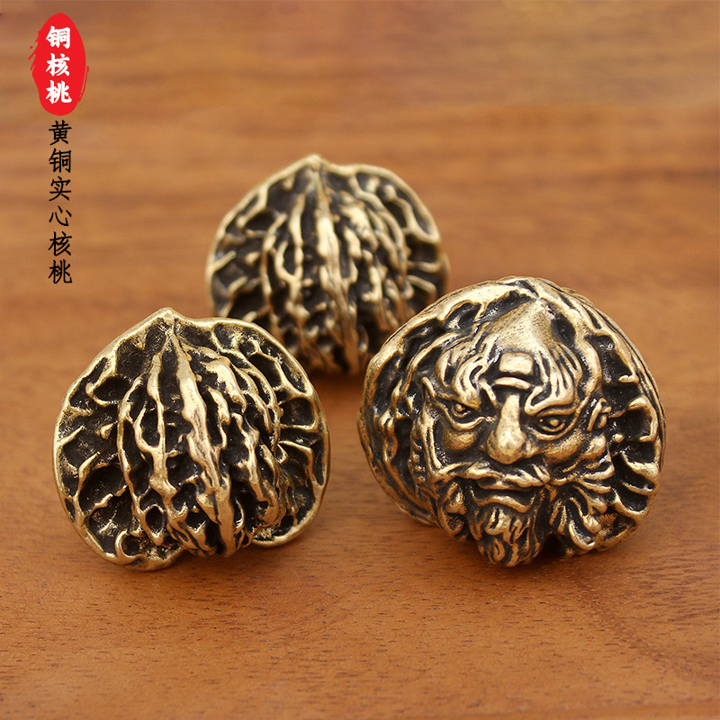黄铜实心文玩古玩核桃手把件一对铜狮子头官帽核桃手把玩摆件握球
