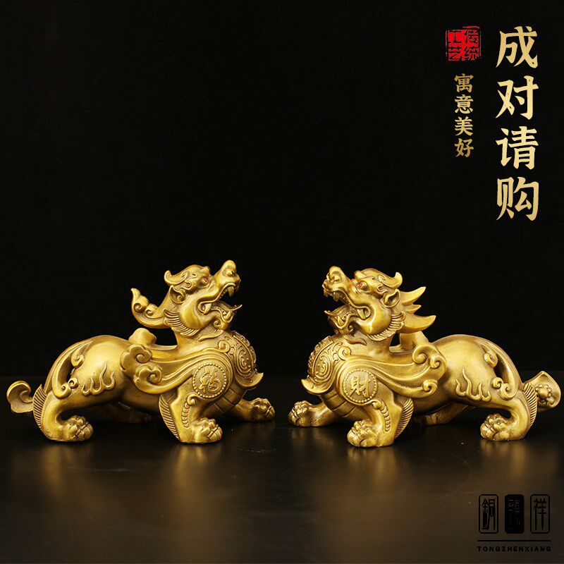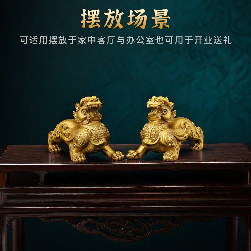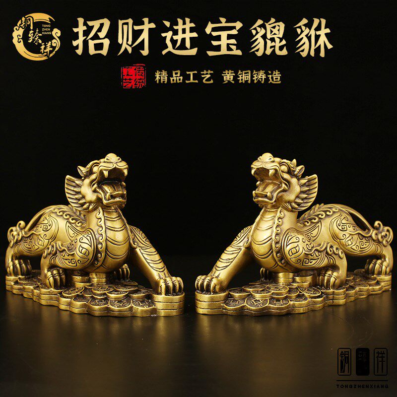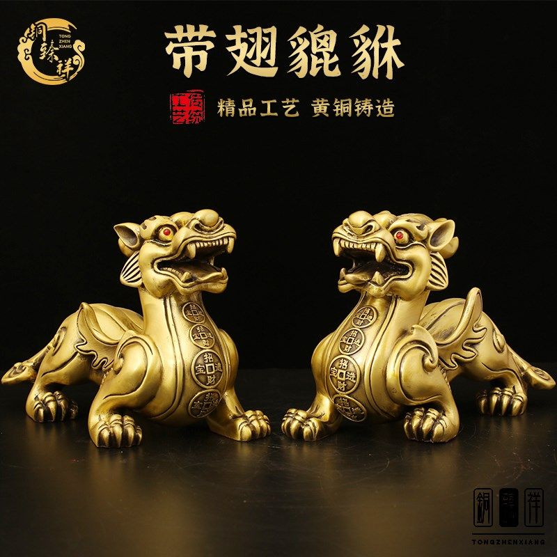 纯黄铜入户开业礼品带翅膀貔貅家里摆件守财一对公母家居玄关摆件