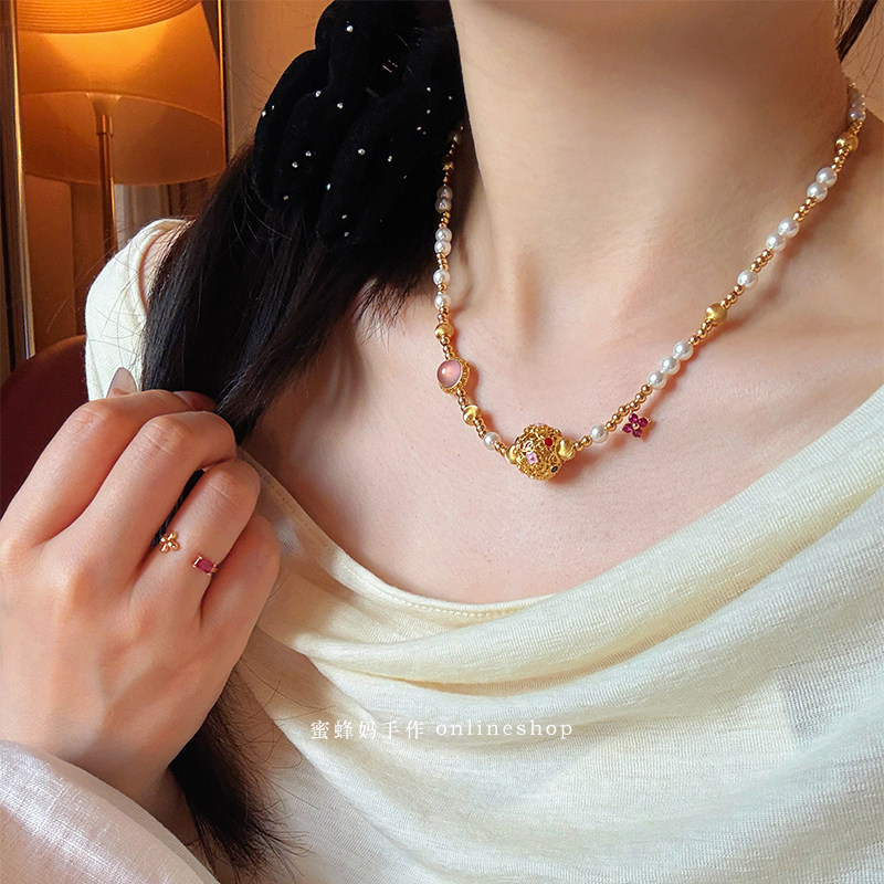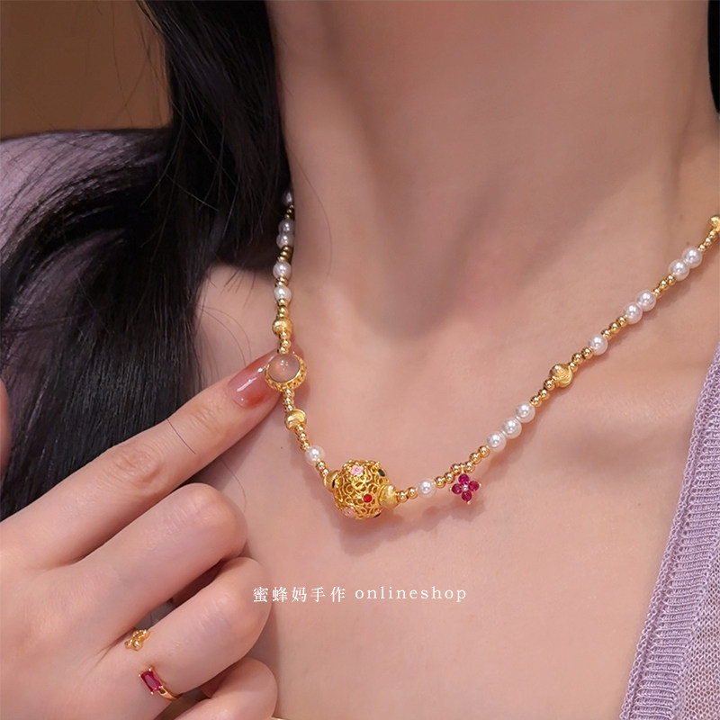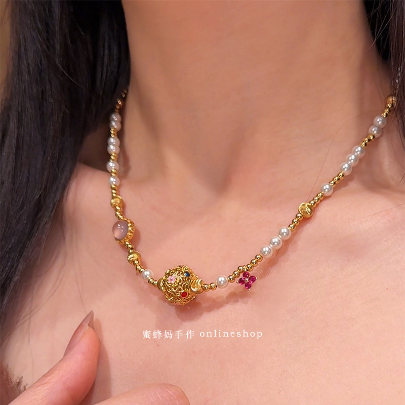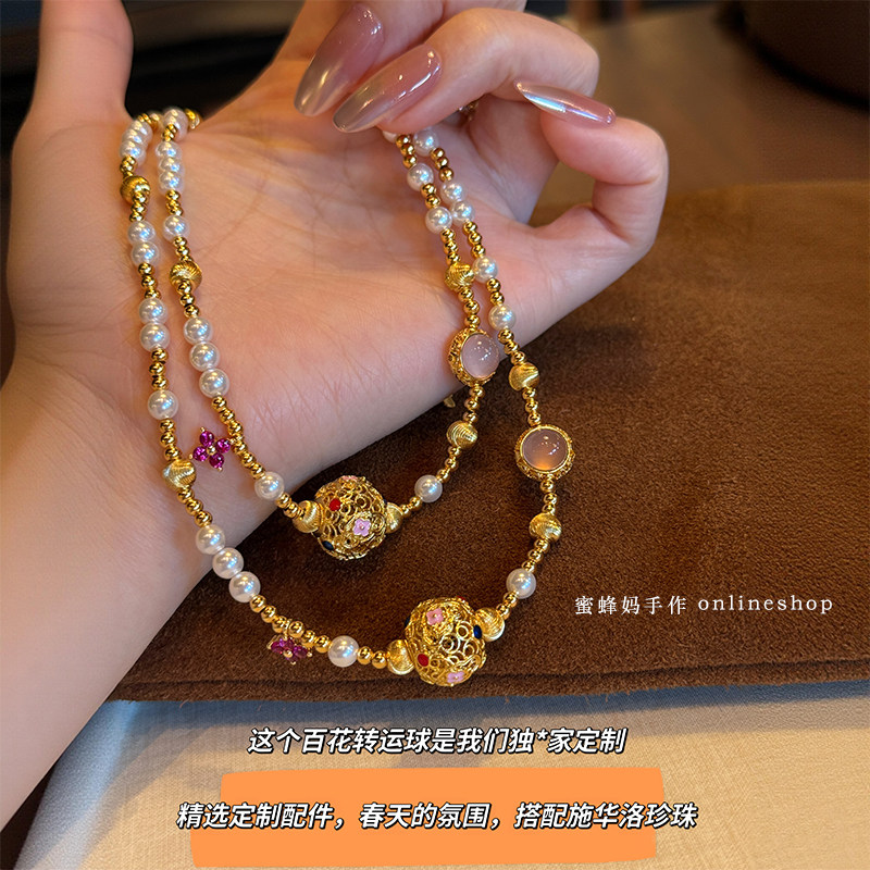 蜜蜂妈手作 原创珐琅百花转运珠珍珠项链女小众高级感气质锁骨链