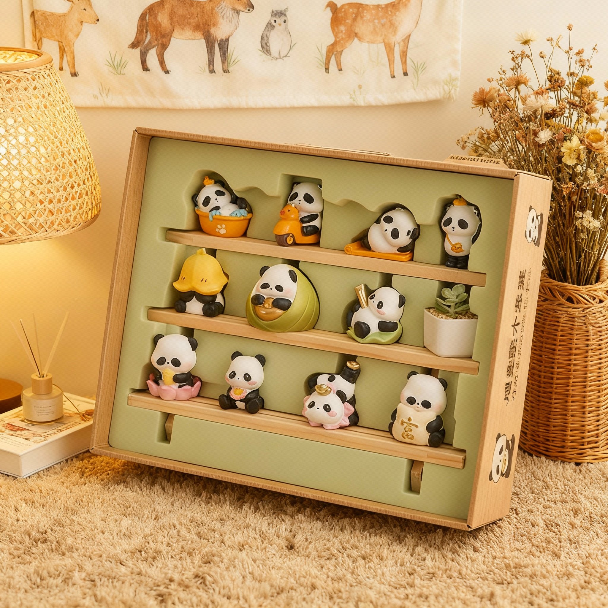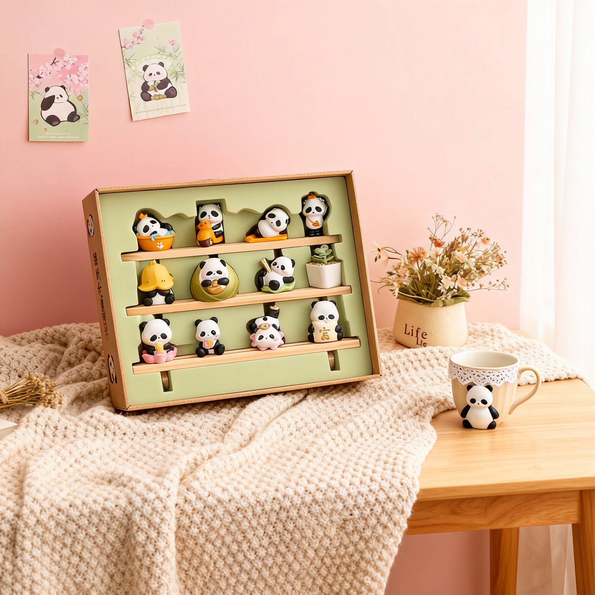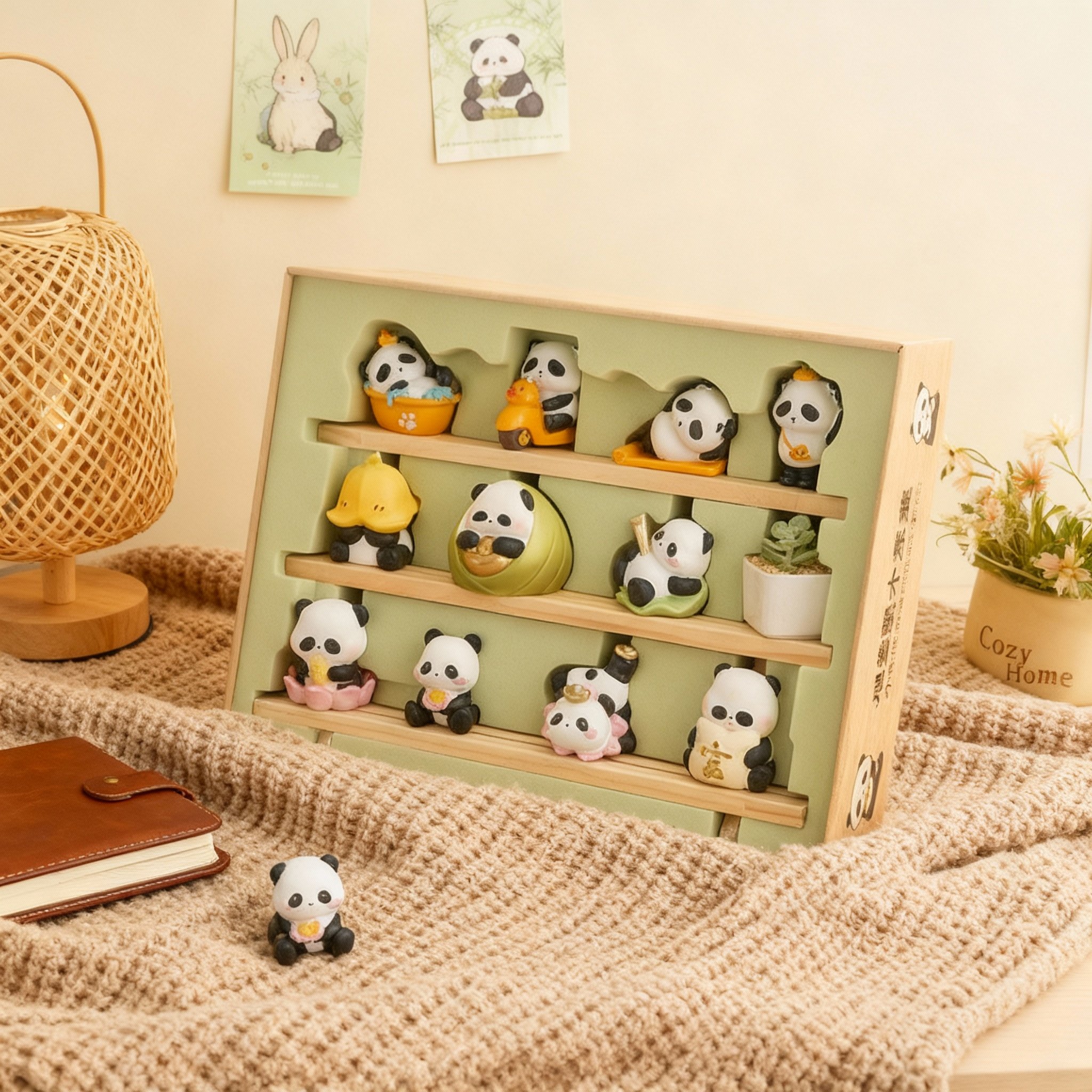可爱熊猫摆件套装木质收纳盒桌面装饰品卡通动物公仔组合