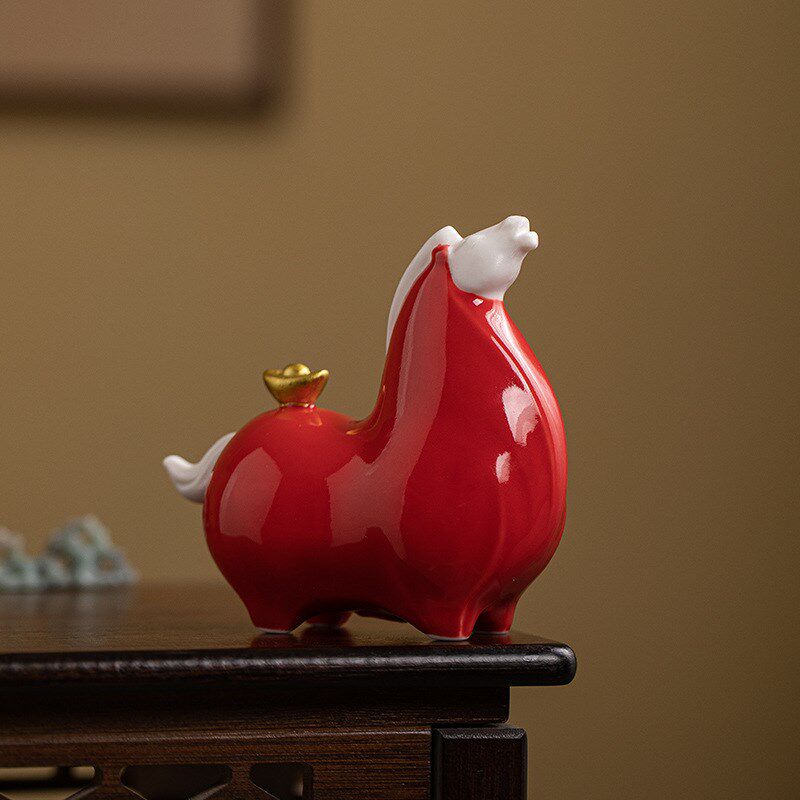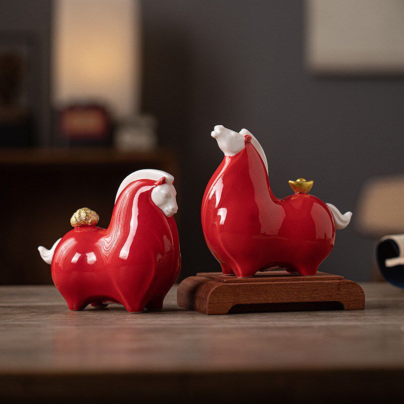 红色陶瓷唐马一对k招财家居玄关酒柜桌面摆件办公室吉祥物生肖马