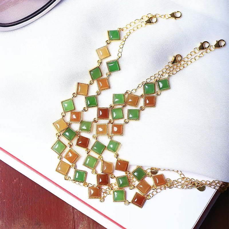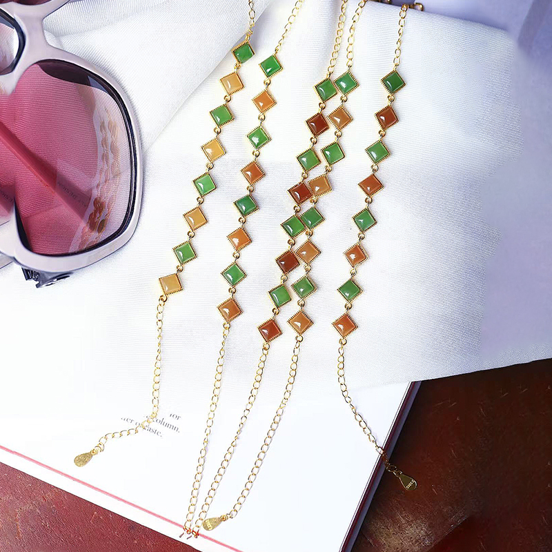 天然和田玉碧玉糖料方块纯银镶嵌款手链女款玉石简约款银手链饰品