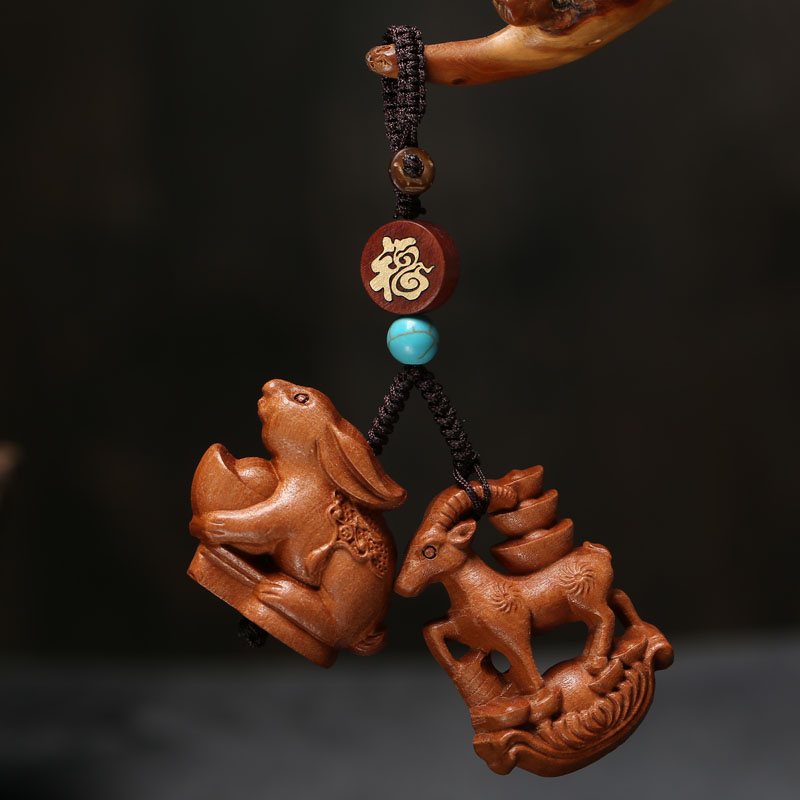2024兔年属羊生肖吉祥物猪兔赐禄桃木雕刻钥匙扣挂件猪兔迎福吊坠
