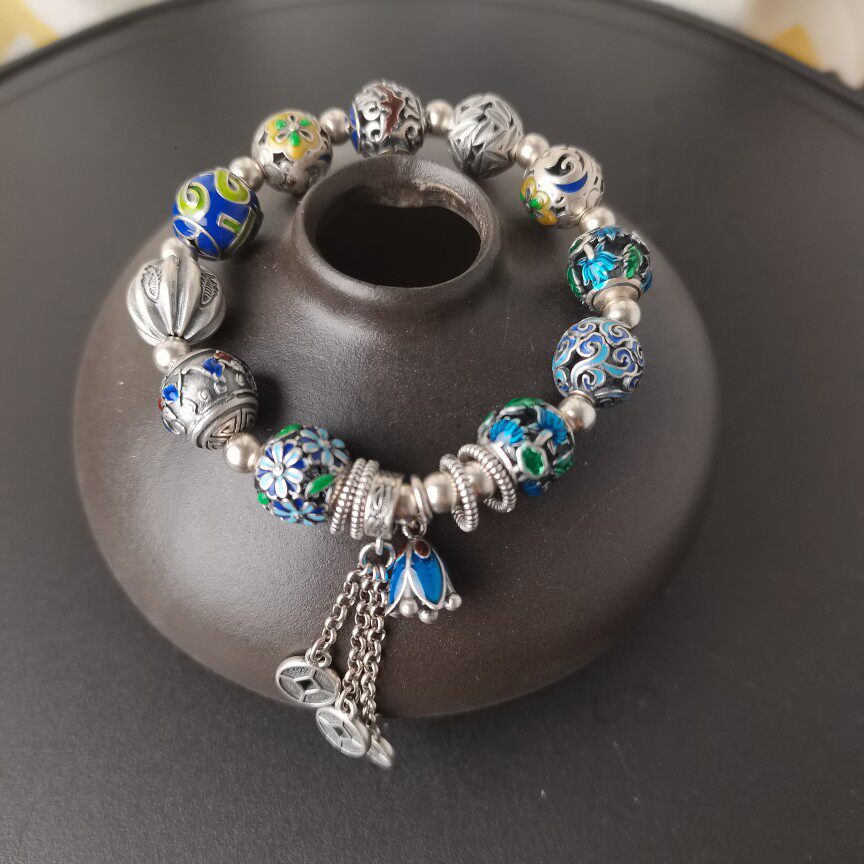 S925纯银珐琅手链珐琅彩花球流苏五帝钱复古民族风女手串39.5克