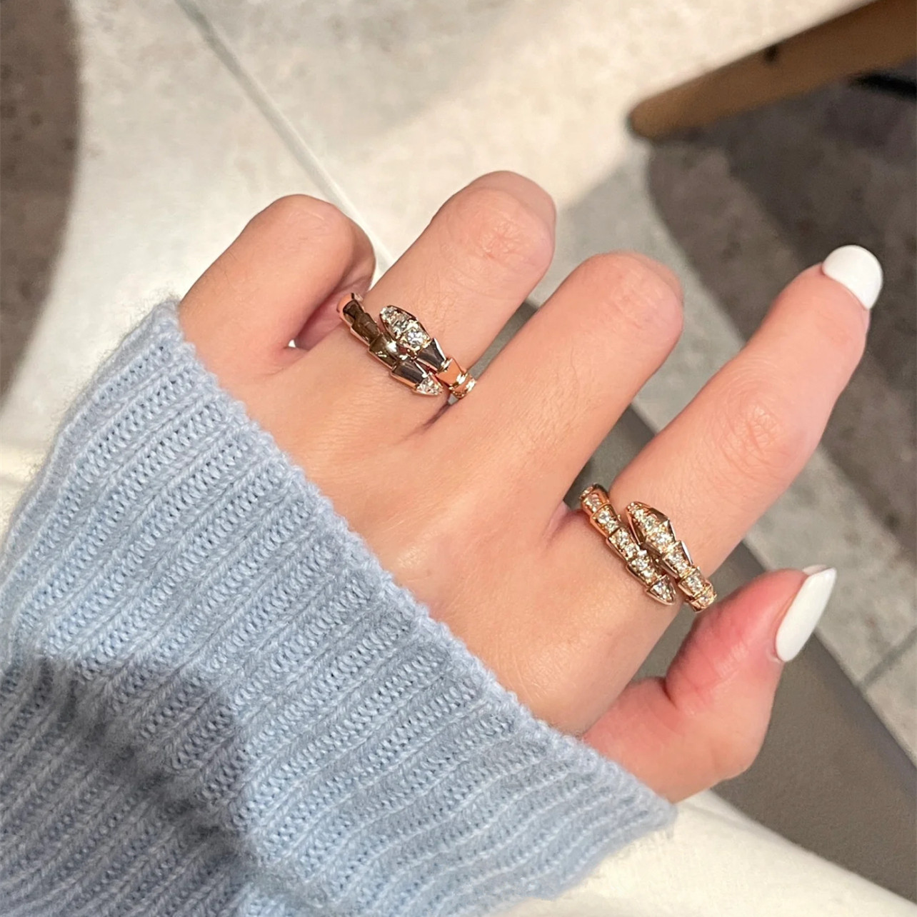 高版本蛇形弹力镶钻戒指女镀18k玫瑰金轻奢精致开口高级感指环