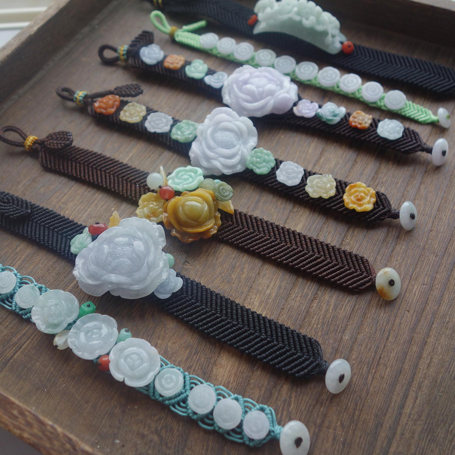 繁花手牌 正品翡翠花朵手牌 花团锦簇原创设计手工编绳荷花玉手链
