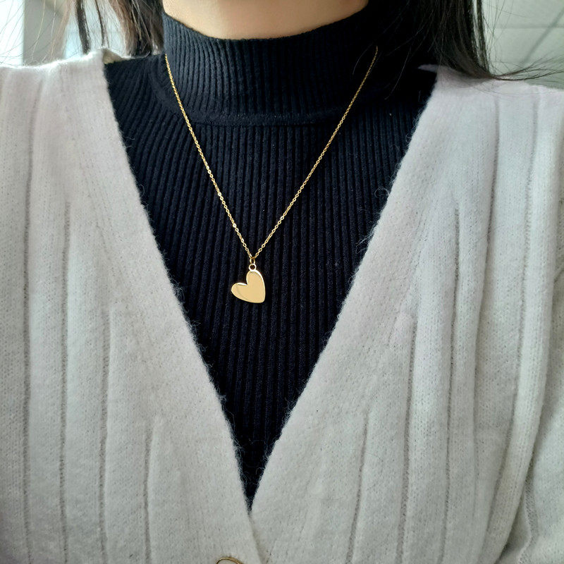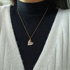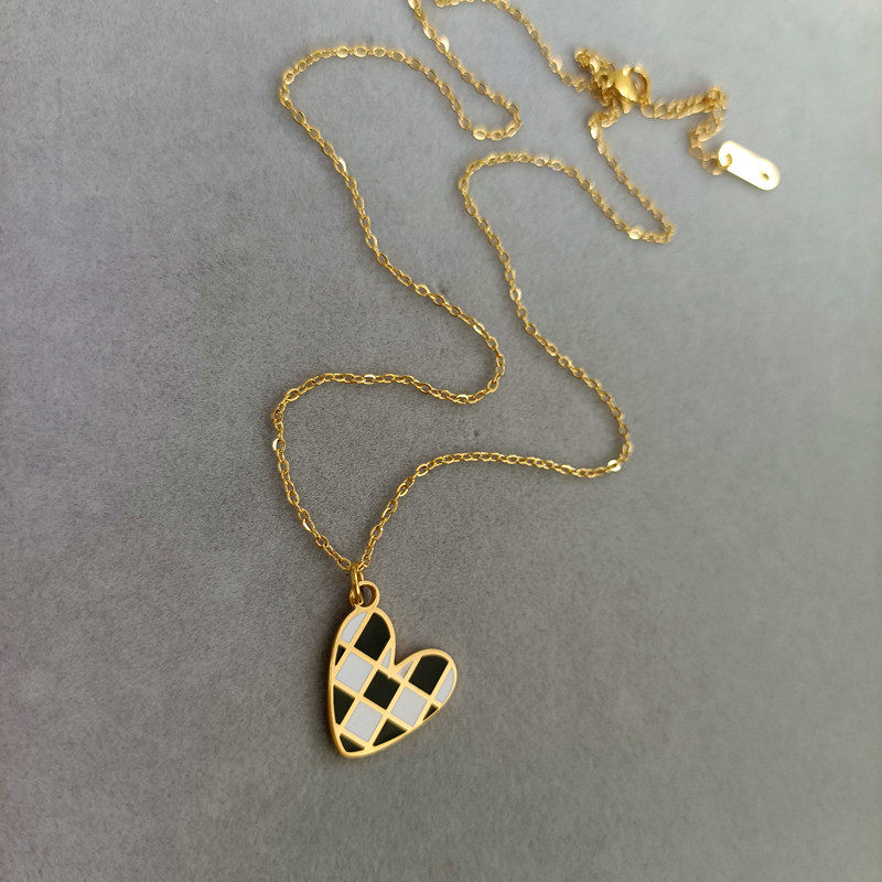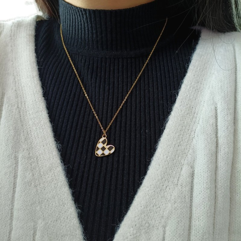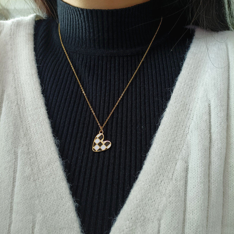 法式复古黑白棋盘格钛钢包金珐琅爱心桃心项链短款毛衣链不掉色