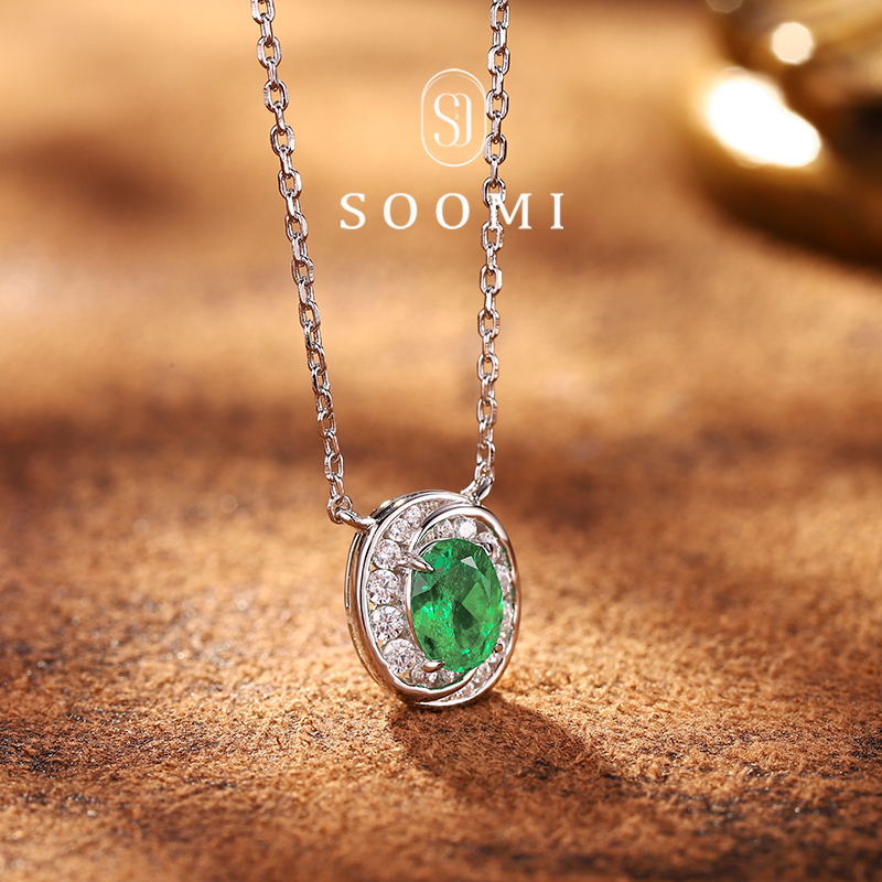 [SOOMI璀璨星空]1克拉培育木佐色祖母绿宝石项链925银时尚吊坠