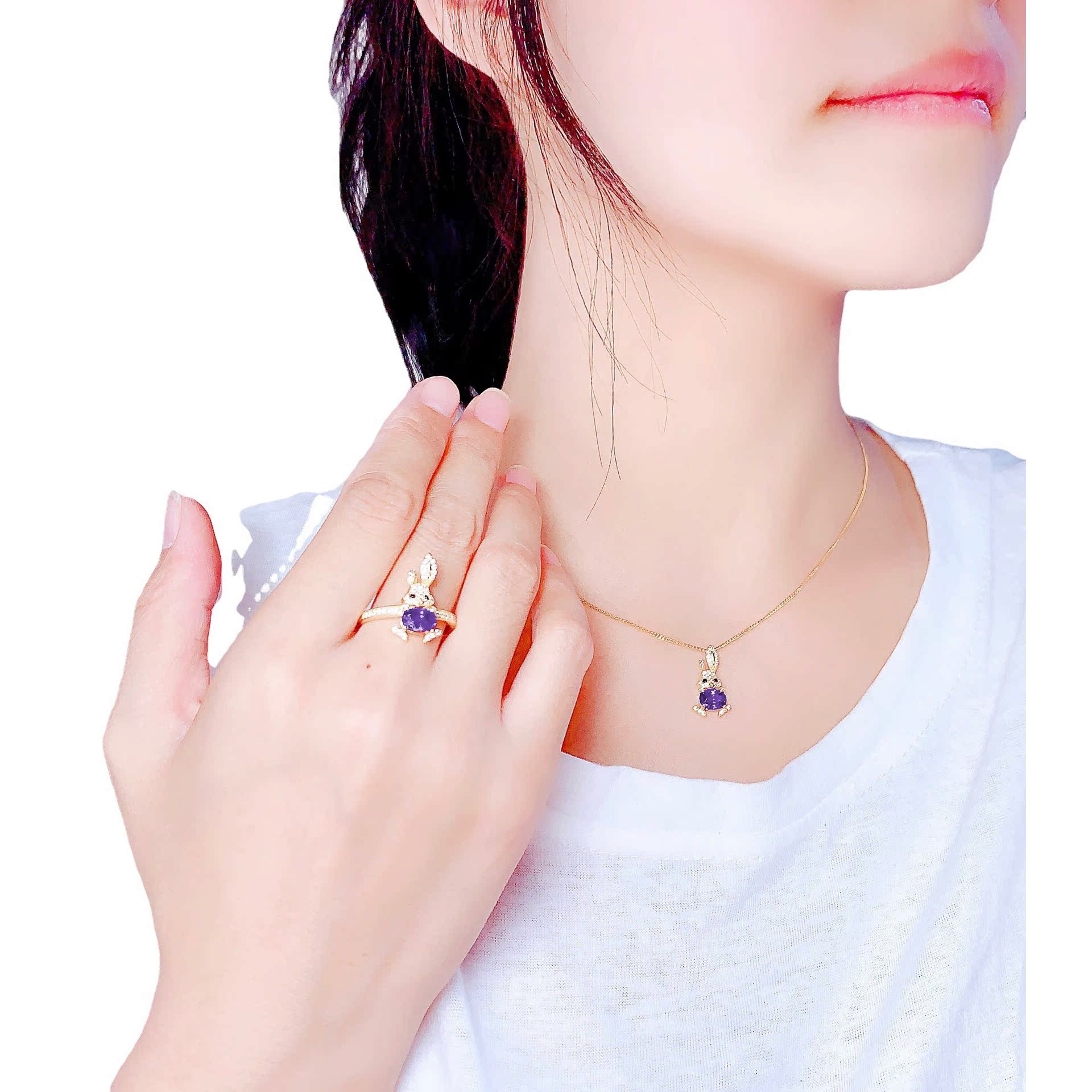 直播新款彩宝项链镀18k黄金紫水晶萌兔子吊坠 微镶满钻小兔戒指女