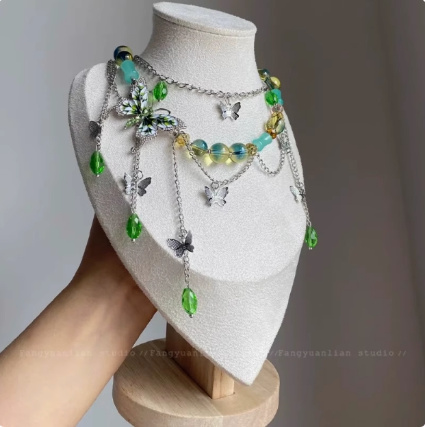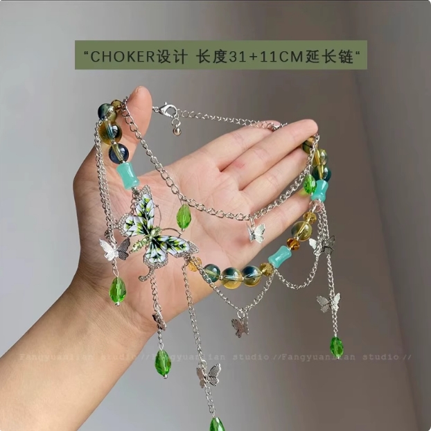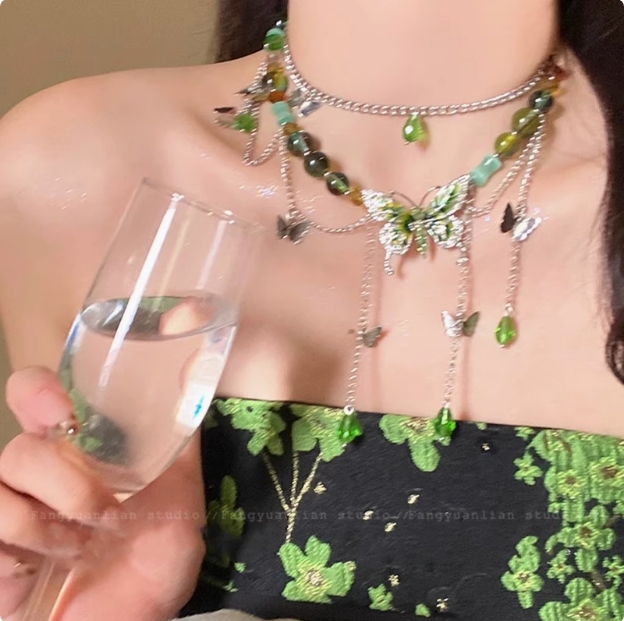 甜酷辣妹绿色镶钻蝴蝶水晶串珠流苏项链女气质叠戴双层锁骨链颈链