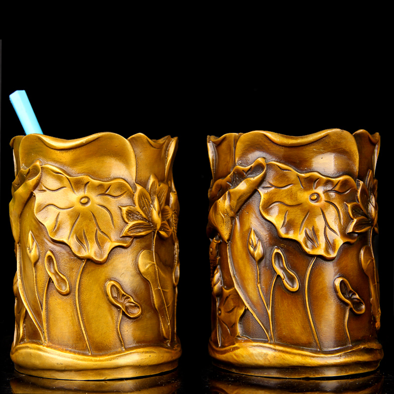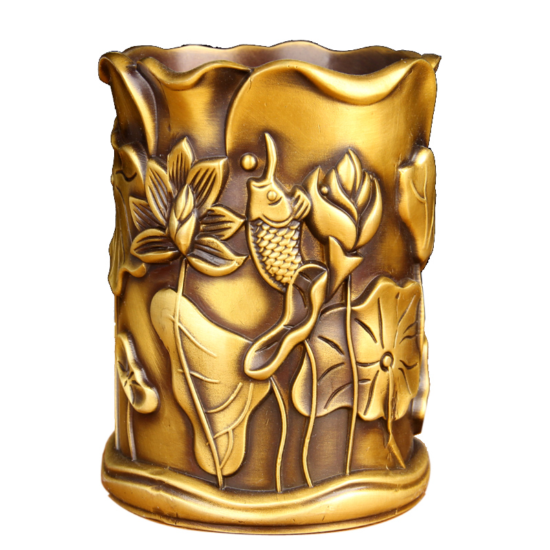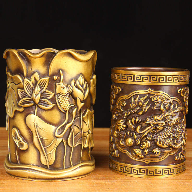 仿古色鱼戏莲叶间铜笔筒摆件 铜祥龙笔筒摆件 大展宏图笔筒