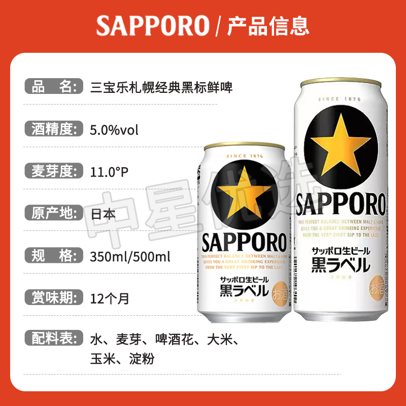 25年10月三宝乐黑标啤酒札幌黑星经典生啤酒拉格日本进口SAPPORO
