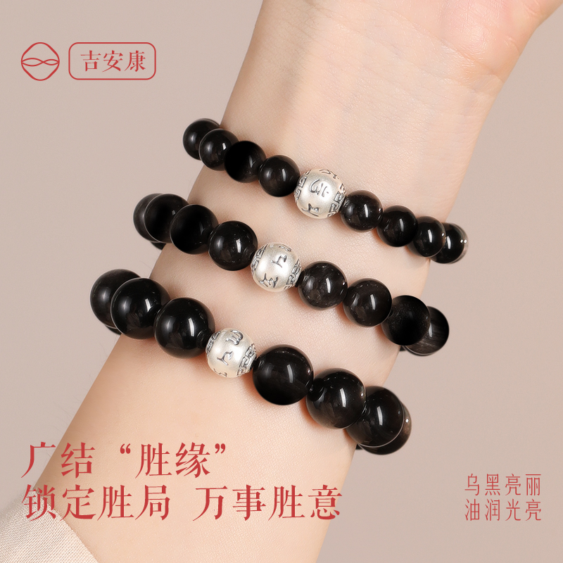 普陀山黑曜石手串女款足银转运珠六字箴言银曜石佛珠手链礼物情侣