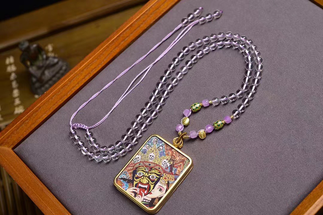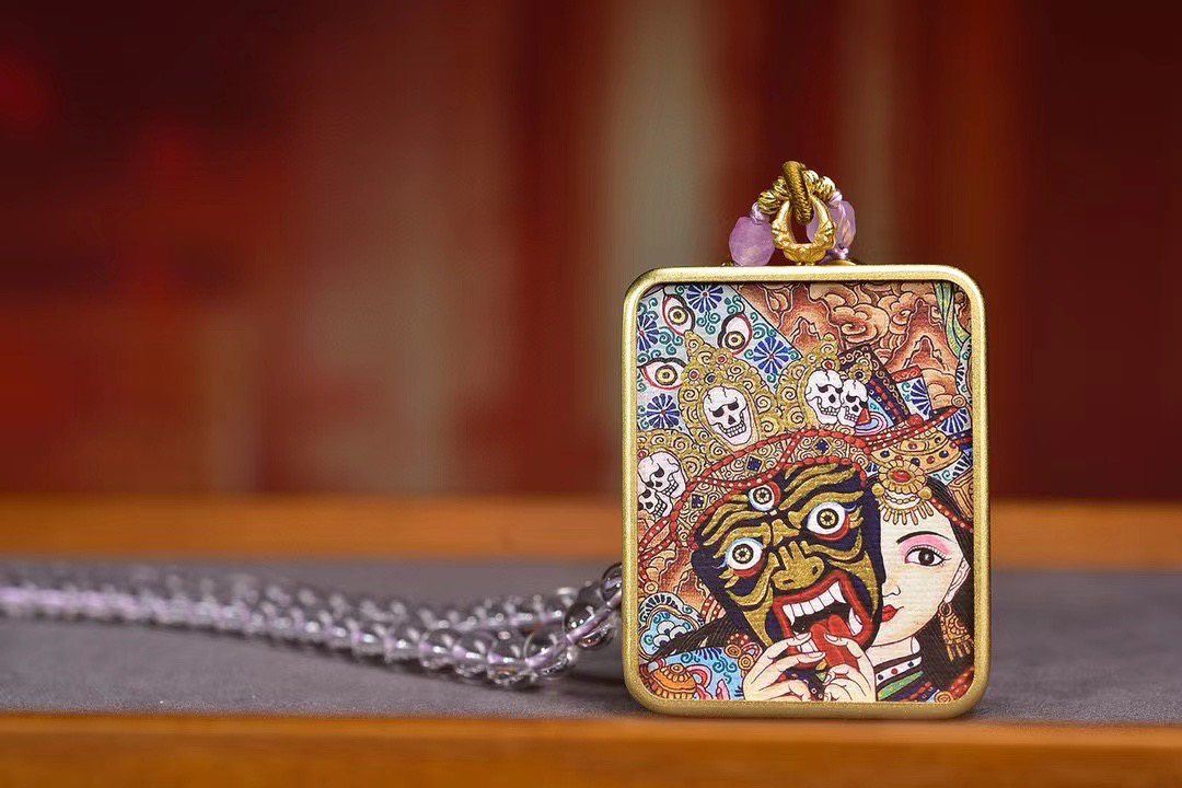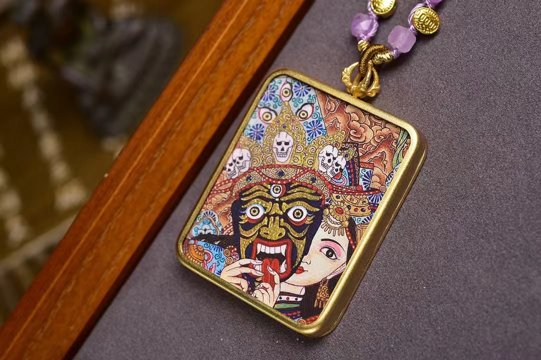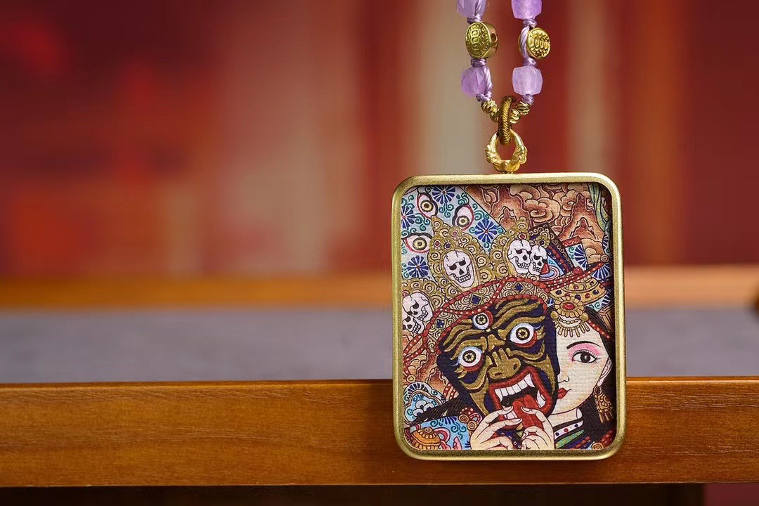 西藏纯手绘扎基拉姆黄黑财神大黑天文殊菩萨药师佛小唐卡佛牌吊坠